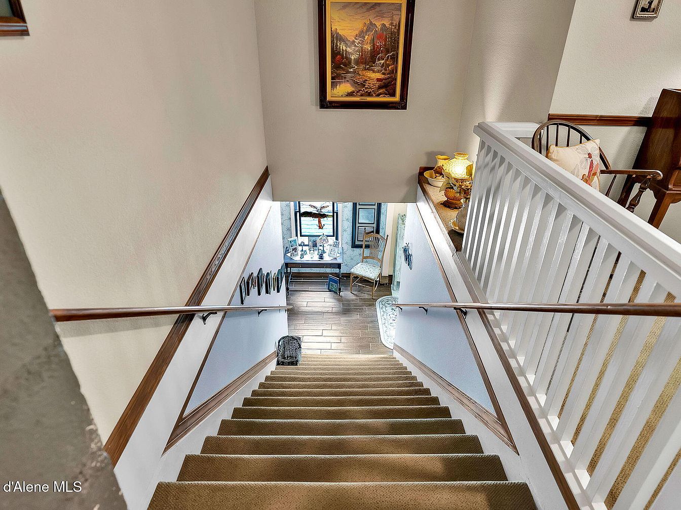 Descending carpeted stairs with a soft tan runner, the space offers a welcoming transition between floors. A sturdy wooden banister with white spindles lines the right, and framed art hangs along the walls. At the top, a small display table holds vintage-style lamps and decorative pieces, evoking a nostalgic atmosphere. Rich wood trim accents the white walls, with a large framed landscape painting adding warmth to the landing. The lower level opens to a bright sitting area framed by large windows, with a glimpse of antique furniture and a patterned rug, highlighting the home’s historic and cozy character.