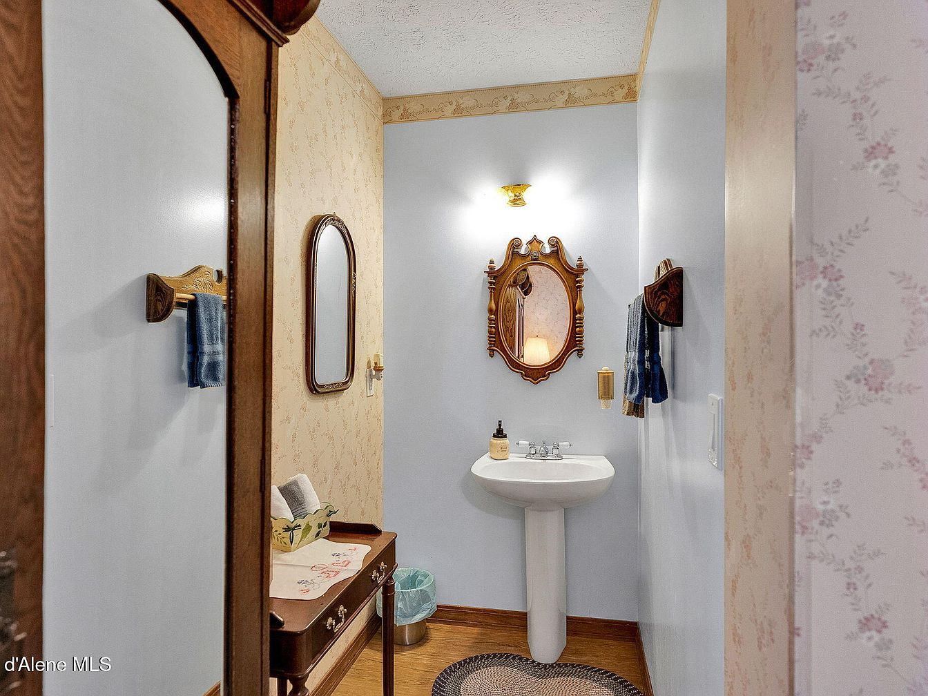 A compact bathroom space with a pedestal sink and an ornate oval mirror framed in wood, reflecting a traditional aesthetic. Pale blue walls are bordered by cream and gold wallpaper with a delicate floral motif, adding a vintage charm. A small table with a dark wood finish sits to the left, topped with folded towels and a floral-embroidered cover. A wall-mounted gold sconce bathes the area in warm light. Wooden towel racks and matching trim maintain a cohesive, classic feel, while a round braided rug anchors the room. Accents of gold and blue blend harmoniously, emphasizing period details.