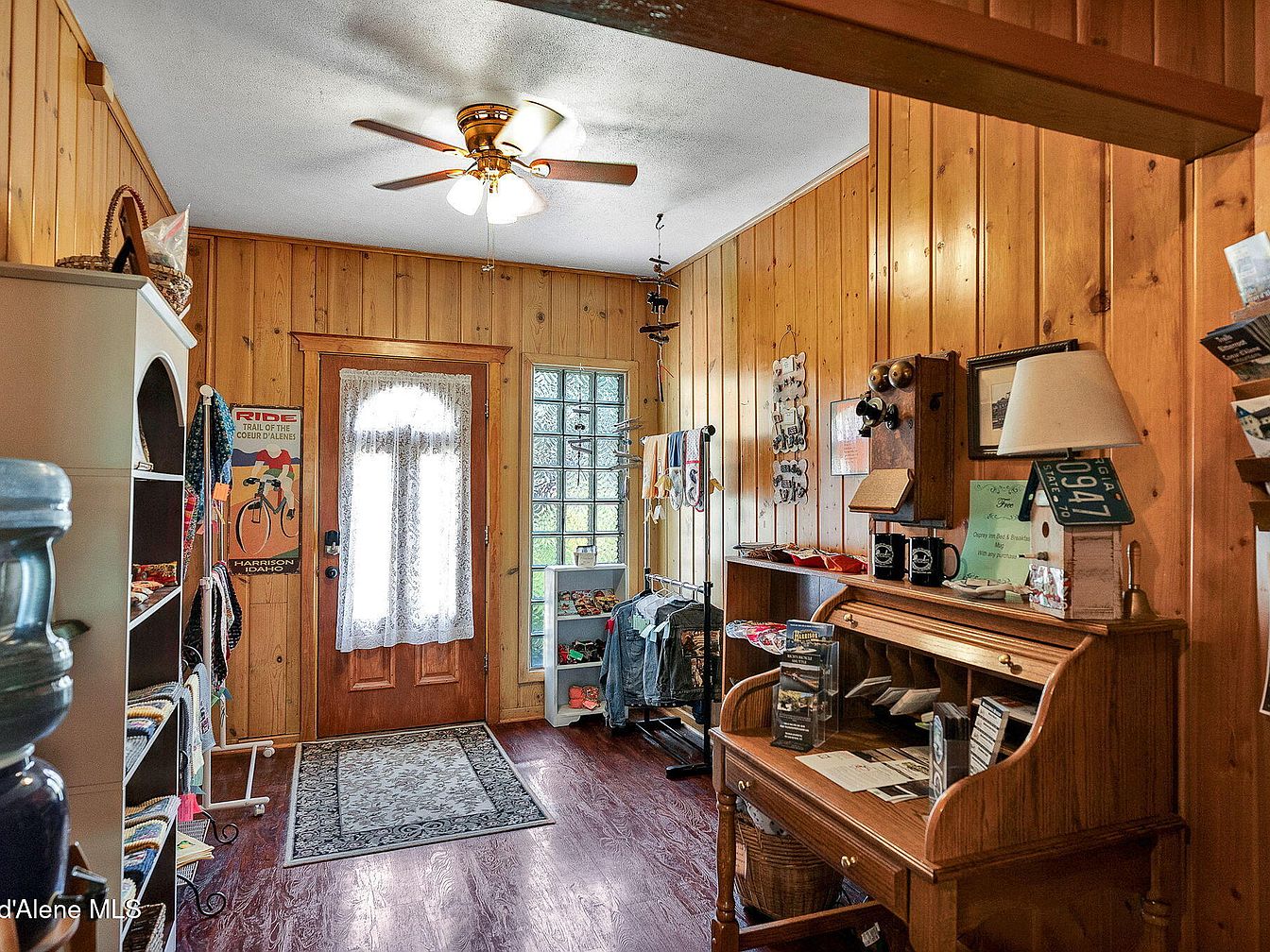 Warm wood paneling covers the walls, giving a rustic and inviting feel. A sturdy wooden door with a lace curtain insert creates a welcoming entrance, flanked by a glass block window that lets in natural light. The ceiling features a brass and wood ceiling fan with light. The floor is finished in dark wood, contrasting with a patterned entry rug. There’s a vintage roll-top desk to the right adorned with paperwork, a lamp, and old-style decor. Organized shelves display various textiles and accessories, while nostalgic wall art and vintage signs add historic character. Everything is arranged neatly, highlighting both function and charm.