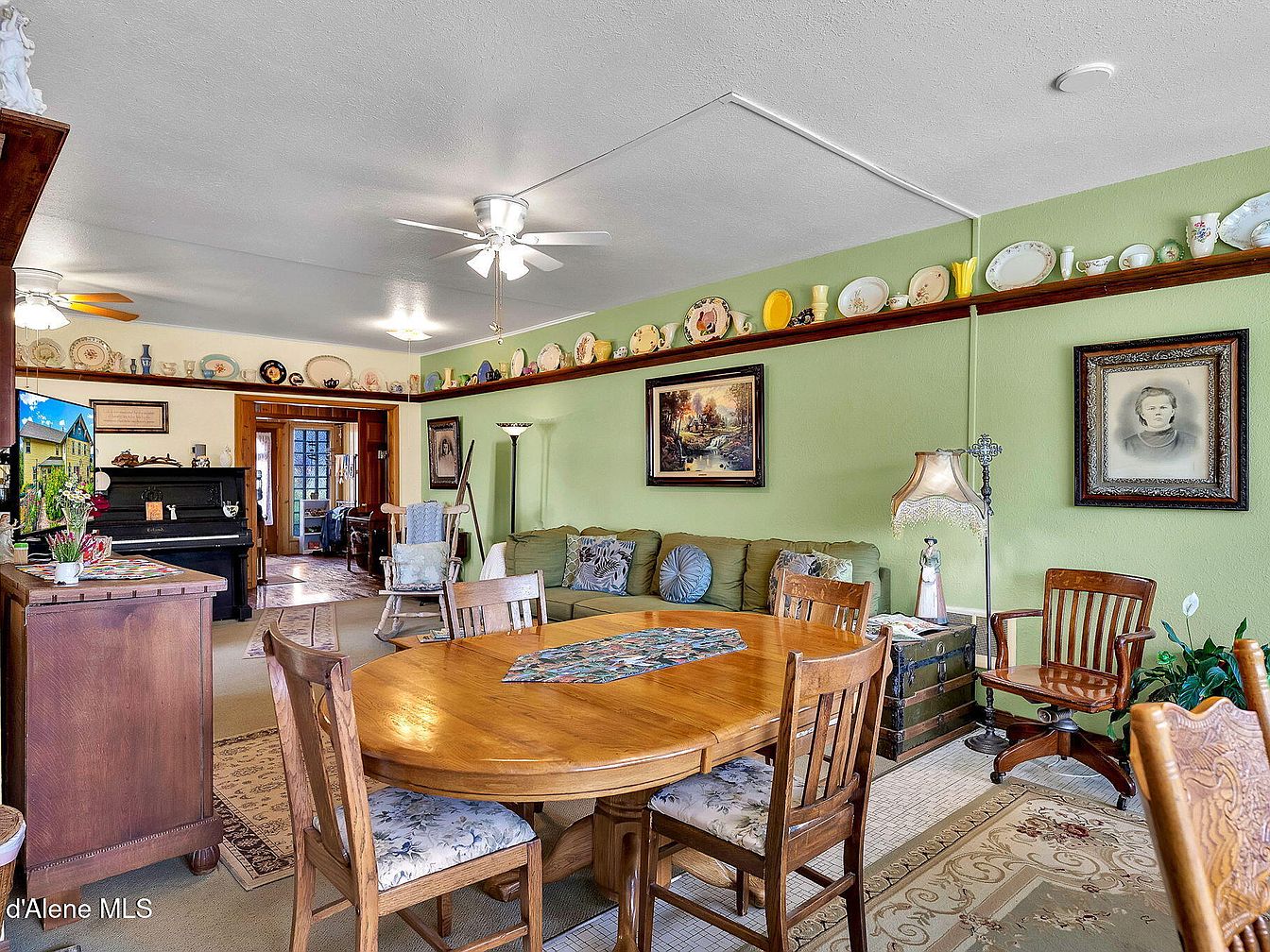 A welcoming dining space features a wooden dining table surrounded by mismatched wooden chairs with floral-patterned seat cushions. Walls are painted a soothing sage green, adorned with framed art and a sepia-toned portrait. A built-in plate rail encircles the room near the ceiling, displaying an eclectic collection of vintage plates, platters, and vases. The room seamlessly extends into a cozy sitting area with a sectional sofa and classic floor lamps, while a black upright piano sits against the far wall. Natural wood door frames, a patterned area rug, and houseplants soften and unify the historic ambiance.