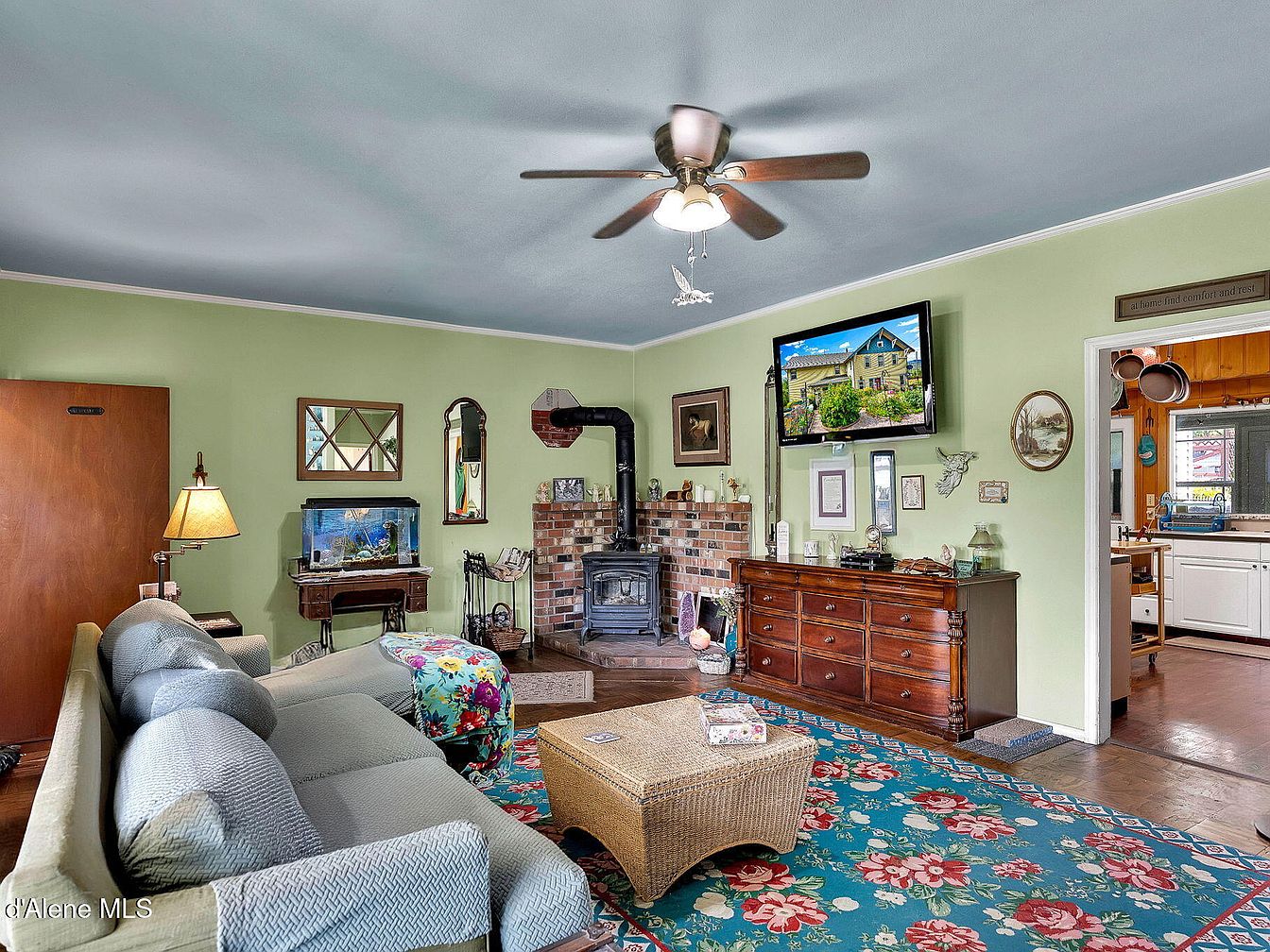 A cozy living room with pale green walls, a cool blue ceiling, and a classic wood-burning stove set inside a partial brick alcove. The floors are covered with a vibrant teal floral area rug, bringing a touch of whimsy and warmth. Furnishings include a cushy light-gray couch, a wicker coffee table with rounded edges, and a vintage wooden sideboard topped with décor. A fish tank sits on a small wooden table, and framed mirrors and artworks adorn the walls. The corner lamp casts soft lighting, and a ceiling fan with wooden blades helps circulate the air, combining vintage and comfortable vibes.