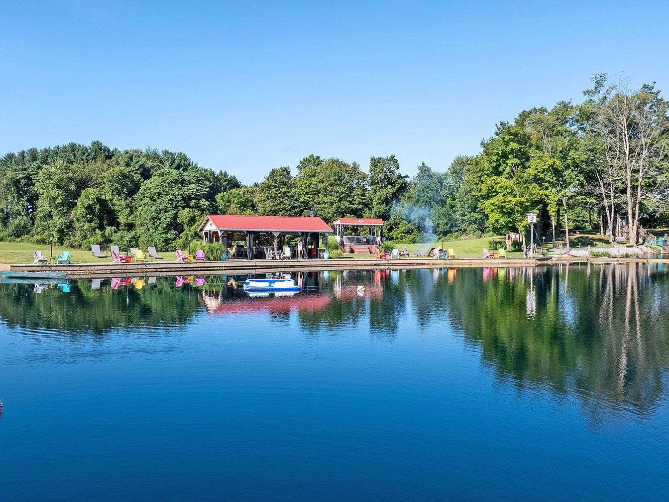 A peaceful lakeside area features a small open pavilion with a red metal roof, set on a wooden dock extending over calm, reflective water. The dock is lined with colorful Adirondack chairs in shades of pink, yellow, blue, and gray, arranged for relaxation and enjoying the view. Behind the pavilion is a grassy lawn bordered by lush green trees, creating a natural, private retreat. The bright blue sky is clear and enhances the vivid colors and relaxed, summery atmosphere. The setting suggests a spot designed for gatherings, lounging, and appreciating the tranquil, outdoor environment.