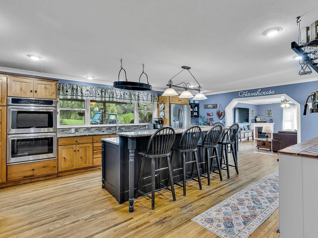 A large, open kitchen space featuring natural wood cabinets and stainless steel double ovens on the left, anchored by a central black island with five tall spindle-back chairs. The warm wooden floors add rustic charm, coordinating with the cabinetry. Broad windows line the wall behind the sink, filling the room with daylight and offering a view of a lush green yard. Above the island hang two distinctive light fixtures: a round chandelier and a row of glass pendant lights. Soft blue walls set a cozy atmosphere, with an adjacent room labeled ‘Farmhouse’ visible through a wide doorway, extending the homely country style.