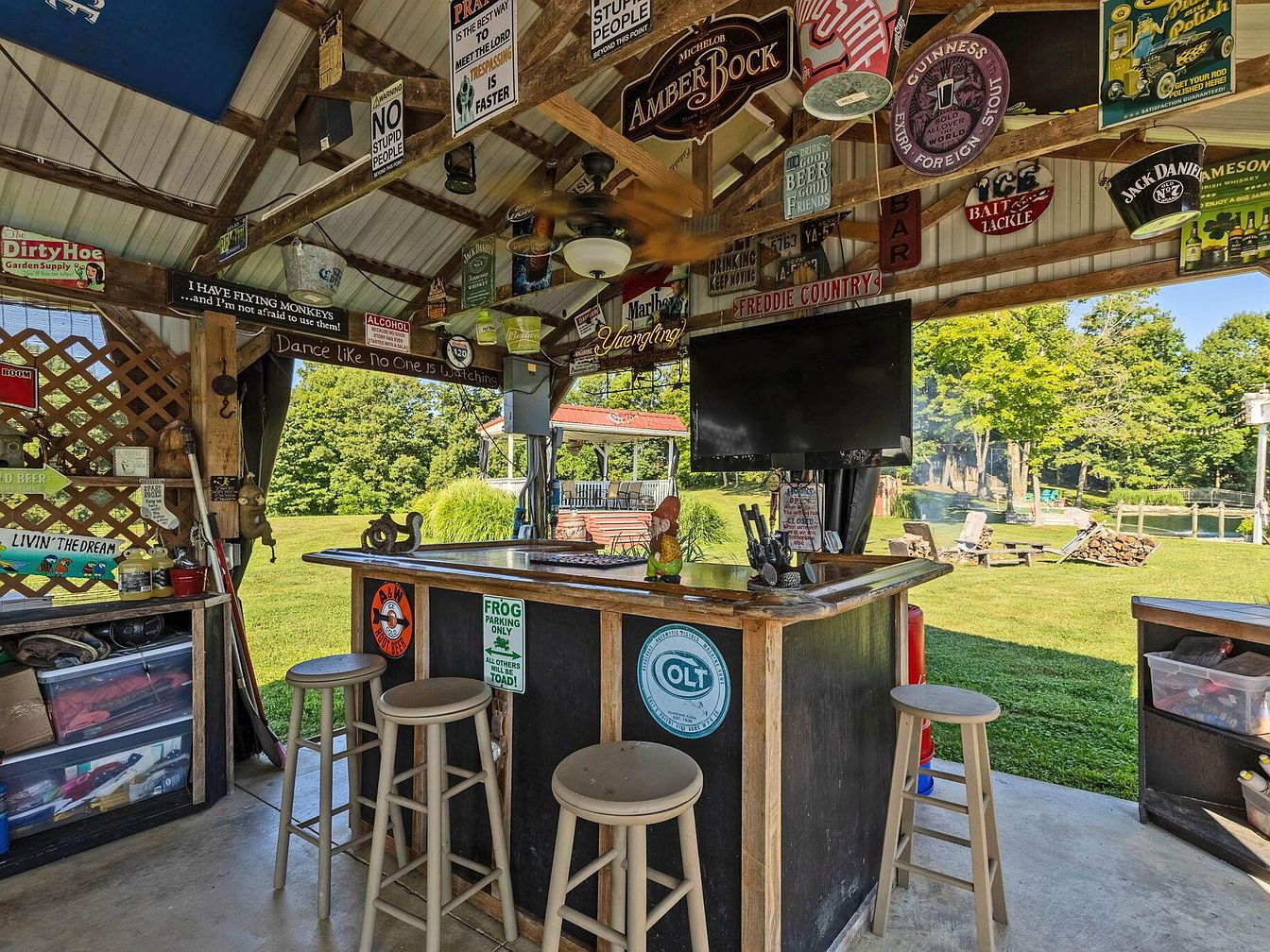 An open-air bar sits under a sloped metal roof supported by exposed wooden beams, surrounded by vibrant green grass. Vintage and humorous metal signs decorate the walls and ceiling, creating a lively, eclectic aesthetic. A wooden bar with a dark countertop stands in the center, accompanied by four light wooden stools. A flat-screen TV is mounted overhead, angled toward visitors at the bar. The area features practical storage shelves filled with tools, drinks, and playful decor. Outdoors, Adirondack chairs circle a fire pit under lush trees, emphasizing a relaxed, social, and rustic atmosphere with strong backyard party vibes.