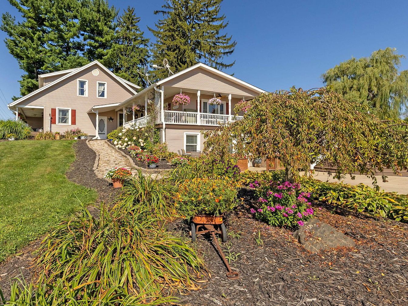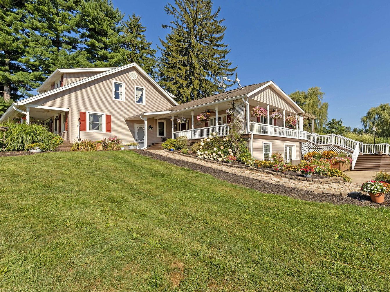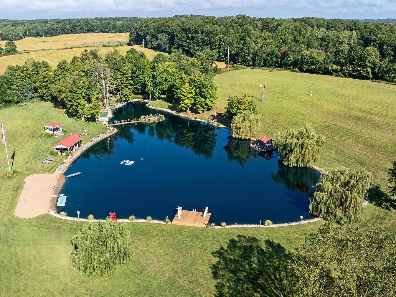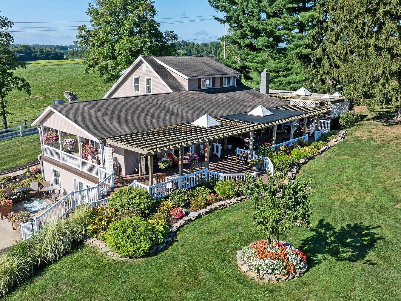 This impressive century home, located in Fredericktown, OH, is steeped in historical charm and versatility, appealing as a resort, event venue, or family compound. Featuring a traditional architectural style with inviting verandas and modern upgrades, the home was originally constructed over 100 years ago and has seen recent renovations to enhance its amenities, including a spiral staircase and updated living spaces. Set on nearly 22 scenic acres, the property consists of four bedrooms, 3.5 baths, expansive leisure, and event facilities, such as a stocked lake, boardwalk, sports courts, indoor arenas, workshop, and cabins. Listed at $1,395,000, the home offers a unique blend of historical significance and modern luxury, making it ideal for hospitality, recreation, or multi-family living.