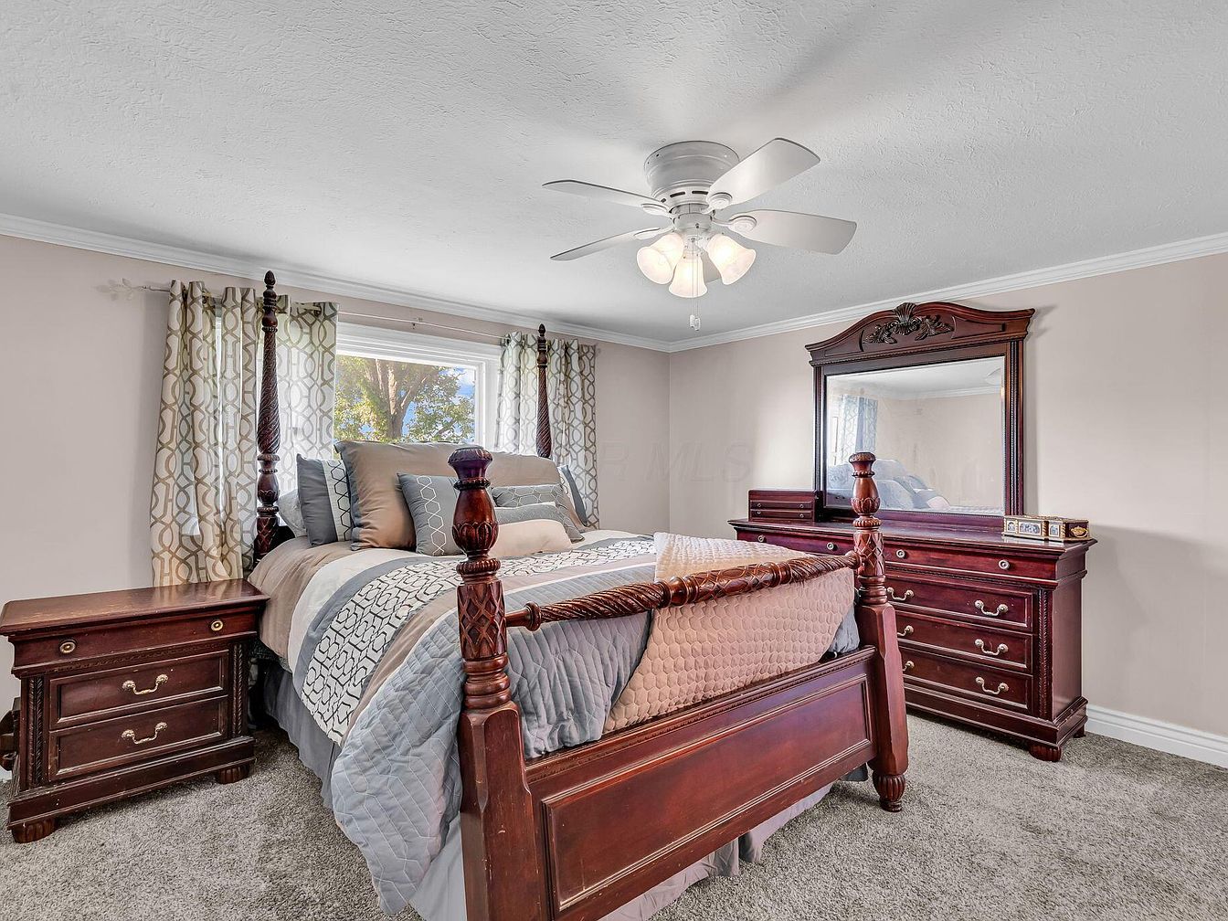 A cozy bedroom features a stately four-poster wooden bed with intricately carved detailing on the posts, positioned in the center of plush gray carpeting. The bed is dressed with a coordinated set of patterned pillows and a comforter in shades of gray, beige, and soft blue. Matching wooden nightstands with brass pulls flank the bed, and a large matching dresser with an ornate mirror stands opposite. Soft beige walls are topped with crisp white crown molding, and a large window allows natural light in, softened by geometric-pattern curtains. Above, a white ceiling fan with lights adds both function and classic charm.