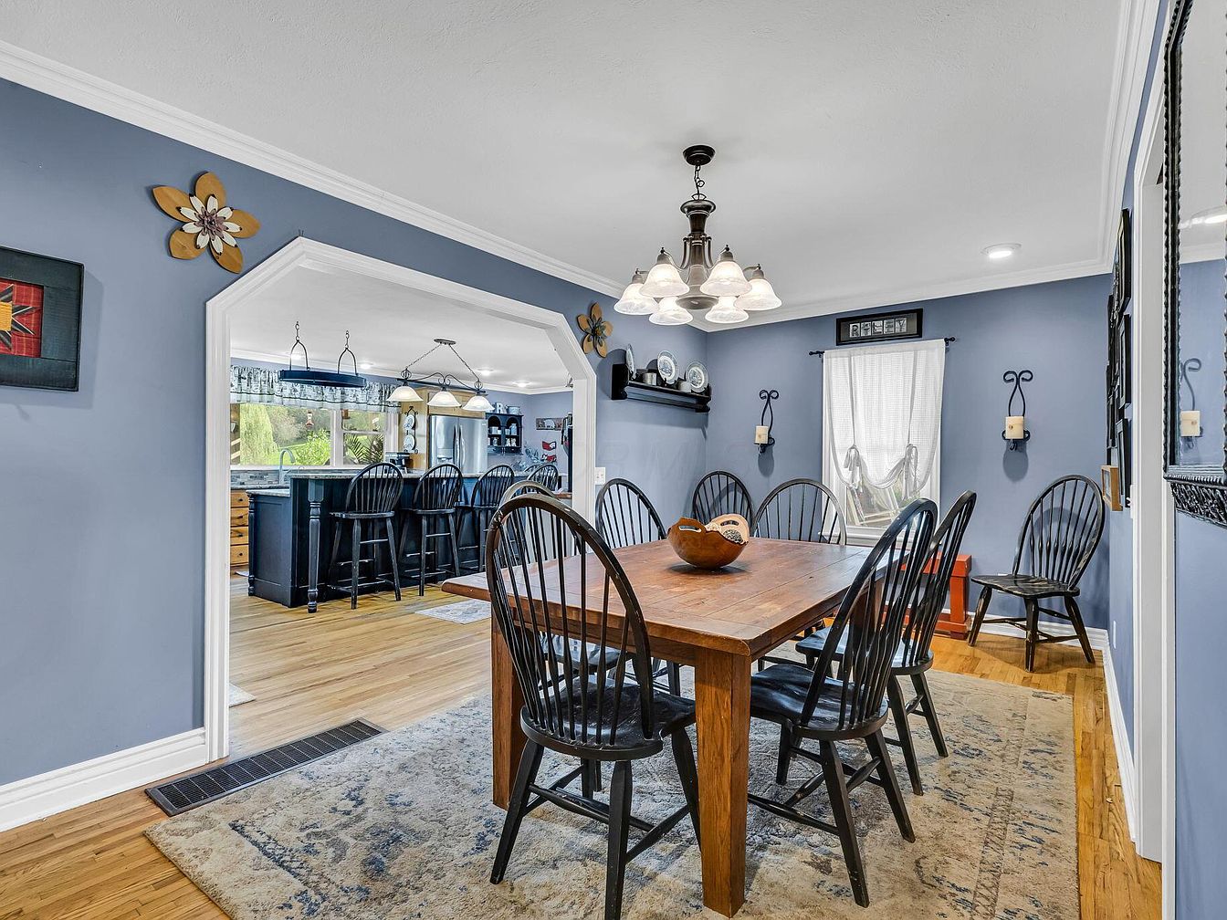 A classic dining room featuring soft slate blue walls with white crown molding and trim, offering a crisp contrast. The rectangular wooden table is surrounded by eight high-back black spindle chairs, sitting atop a large, neutral-toned area rug that adds subtle texture. Light flows in from a single window dressed with a simple white curtain, flanked by wall-mounted candle sconces. Decorative flower wall sculptures and framed art enhance the cozy ambiance. A five-light chandelier with frosted glass shades hangs above the table, and a wide archway opens seamlessly to a kitchen area with matching spindle bar stools and hardwood flooring throughout.