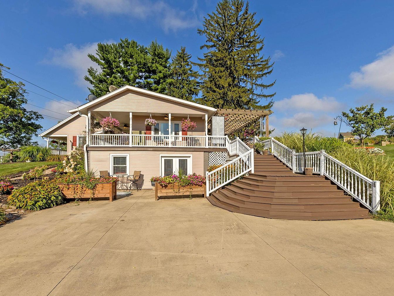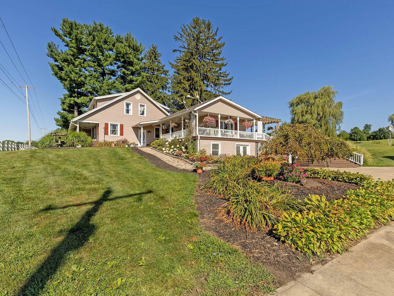 The house sits atop a gentle, sloping hill covered with lush, well-maintained grass. Soft beige siding with white trim and red accents give the home a traditional, inviting appearance. The sprawling front porch features white railings, hanging baskets of pink flowers, and a set of stairs curving down to a landscaped path. Colorful flower beds and manicured shrubs border the walkway, adding charm and vibrancy to the scene. Majestic evergreens and mature deciduous trees provide a picturesque backdrop, and the expansive blue sky enhances the property’s open, serene ambiance. The overall atmosphere evokes classic rural Americana.