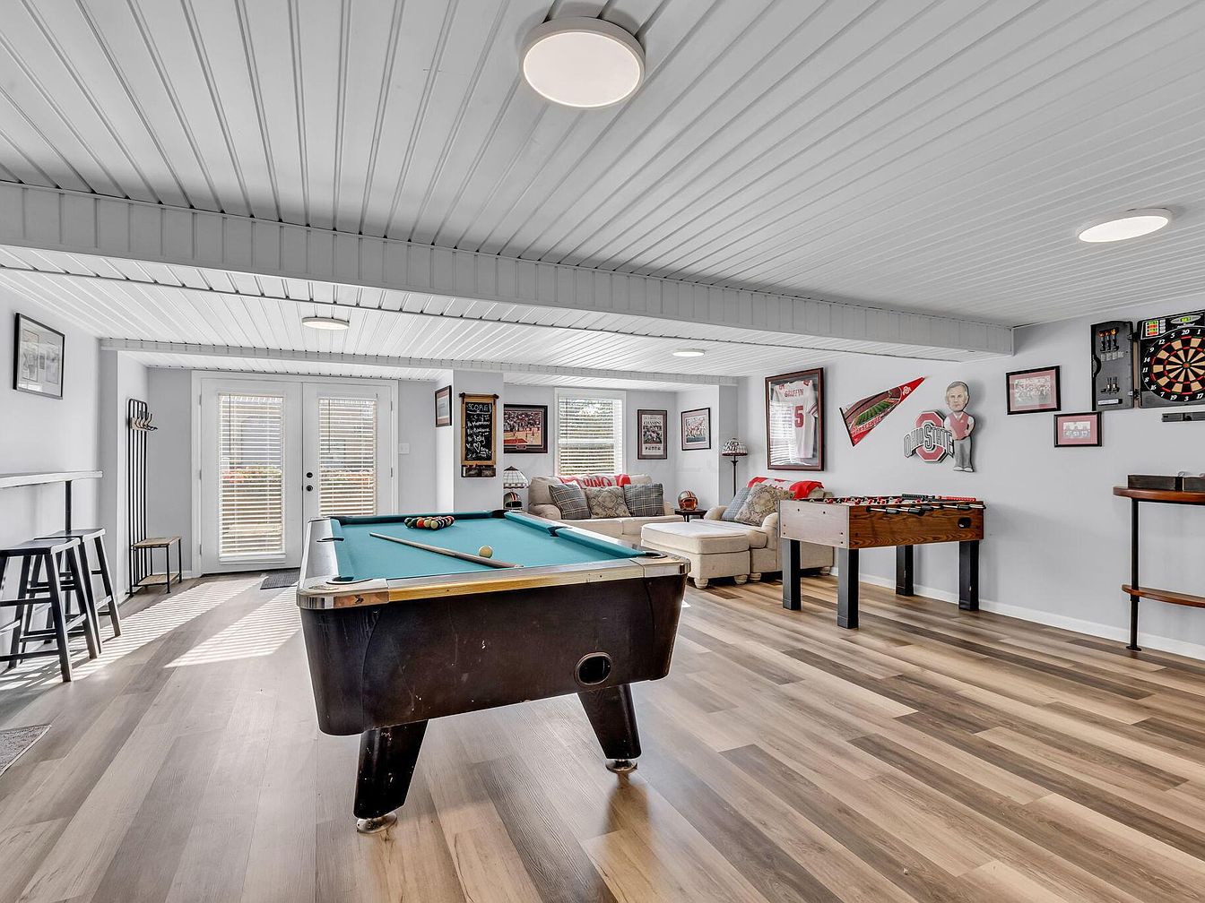 A spacious game room with a light, coastal aesthetic features crisp white paneled ceilings and soft gray walls. The room is anchored by a central pool table, with a foosball table and wall-mounted dart board nearby, creating a lively recreational space. Sports memorabilia, jerseys, pennants, and caricature art decorate the walls, providing energetic charm. Large double French doors with blinds lead to the outdoors, allowing plenty of natural light to pour in. A sectional sofa with cozy throw pillows occupies the back corner, and bar stools line a counter along one wall. Pale wood flooring completes the inviting, playful atmosphere.