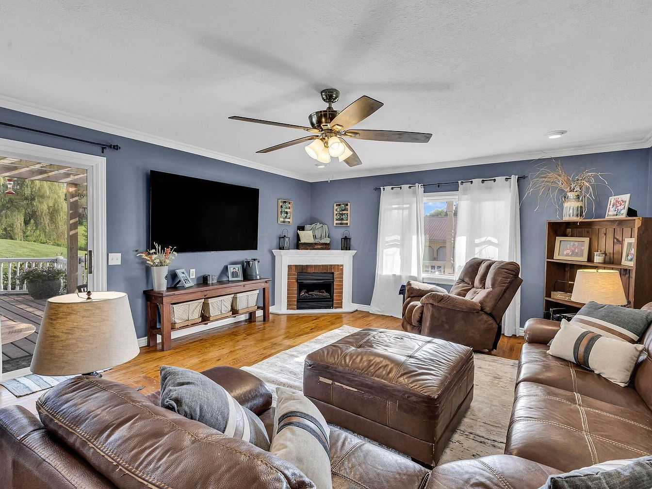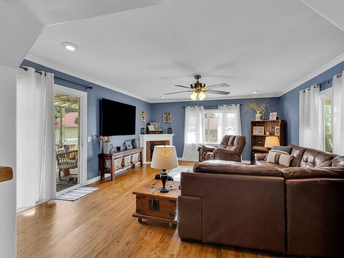 Spacious living room featuring blue walls with crisp white trim and crown molding. Natural wood flooring adds warmth, complemented by a large brown leather sectional and two recliner armchairs. A rustic wood coffee table sits centrally, topped with a small lamp. Large windows dressed with sheer white curtains allow ample natural light, while a modern ceiling fan with lights hangs overhead. A white brick fireplace anchors the far wall, with a flat-screen television mounted above a slender console table. Shelves and a bookcase filled with framed photos and decorative items provide a homey atmosphere, and glass doors lead to an outdoor patio area.