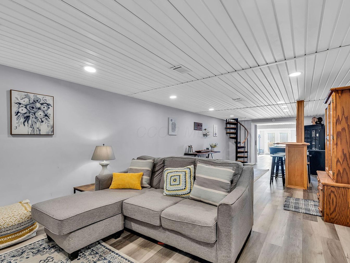 A cozy basement lounge features a light gray sectional sofa accented with a yellow and a patterned throw pillow. To the left, a soft rug and stacked cushions create a relaxed corner. The pale lavender-gray walls are adorned with a floral painting and minimal wall art. A side table with a classic lamp sits next to the sofa. The ceiling has white vertical paneling and recessed lighting, giving the space a bright, modern feel. Warm wood accents are seen in the cabinetry and spiral staircase at the back, while light vinyl plank flooring adds to the airy, welcoming aesthetic.
