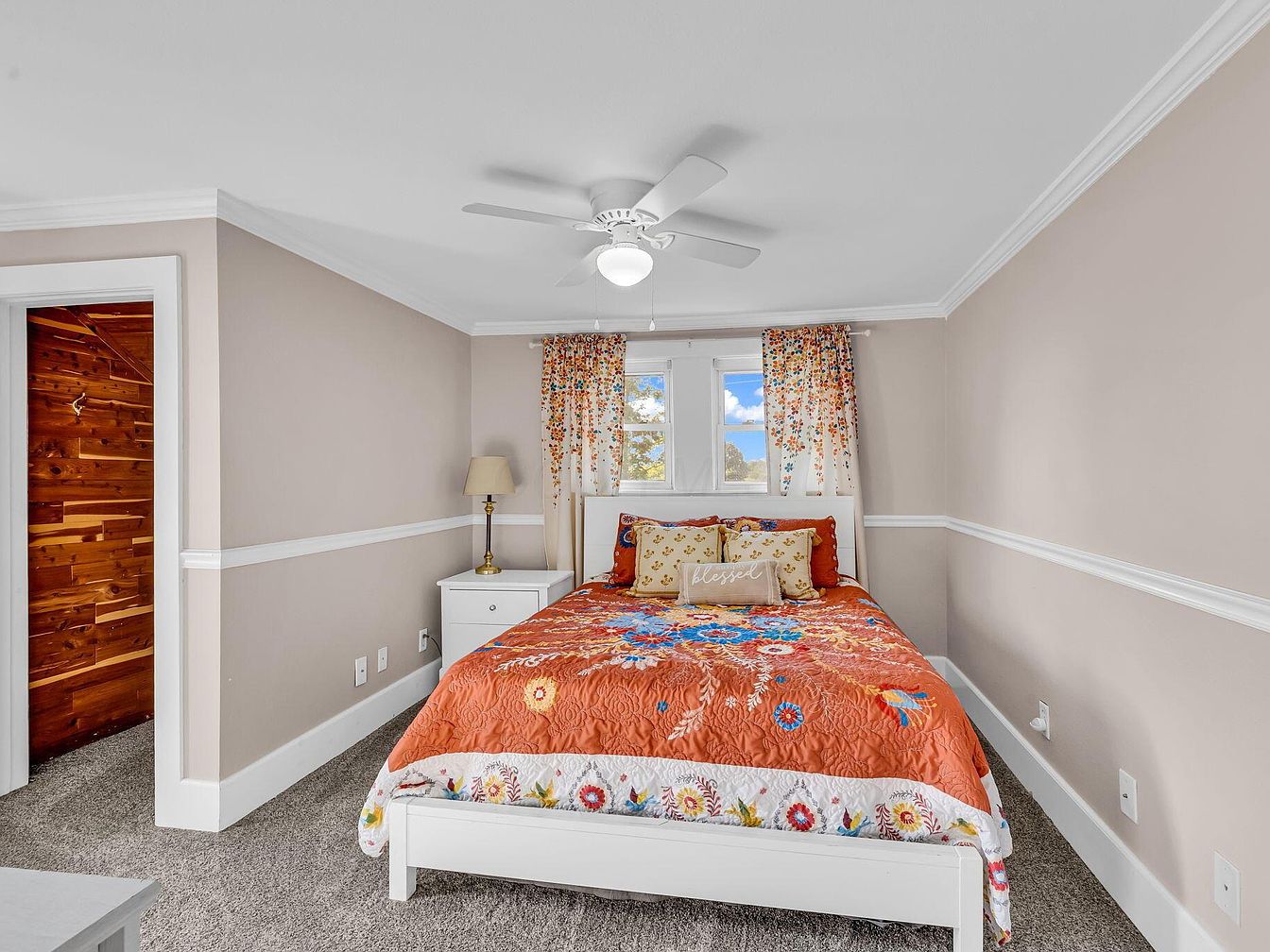 This bedroom features soft beige walls accented by white trim and crown molding, creating a peaceful, light-filled atmosphere. The room centers on a white-framed bed with a vibrant orange and floral-patterned quilt, paired with decorative pillows in warm tones and a prominent ‘blessed’ pillow for a cozy touch. Beneath the bed, plush grey carpet adds comfort underfoot. A single white nightstand with a classic brass lamp sits to the side of the bed. Light-filtering floral curtains hang over three small windows, while a white ceiling fan and subtle recessed lighting provide illumination. The adjoining doorway leads to a wood-paneled closet area.