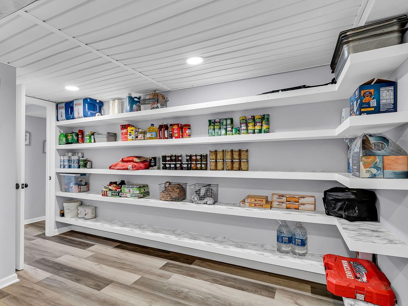 A long, spacious pantry lined with open white shelves runs along the right wall, offering generous storage space for canned goods, dry foods, and household supplies. The shelves are organized with clear categories: canned vegetables, jars, large water bottles, cleaning products, and paper towels. Some items are kept in wire baskets for easy access, while bulky packages are stacked neatly on the lower shelves. The walls and ceiling are painted crisp white, creating a clean and bright atmosphere, while the light wood-look laminate flooring adds warmth and visual interest. Recessed lights provide ample illumination throughout the room.