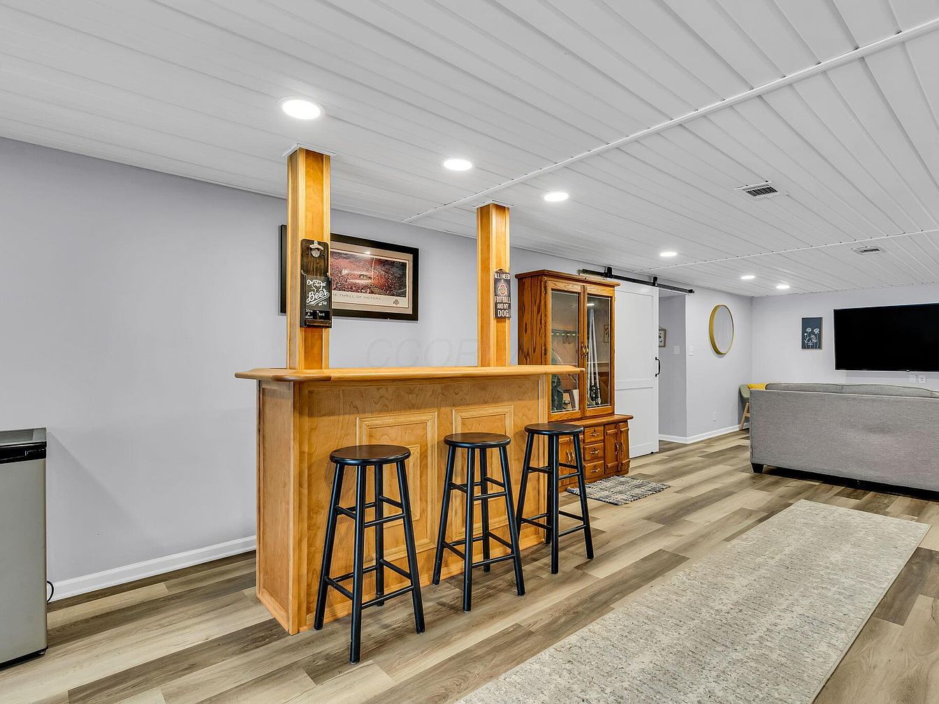 This space features a cozy home bar with a warm, honey-toned wooden counter and three sleek black stools set against a backdrop of soft gray walls. The flooring is a wood-look laminate in light, natural tones, enhancing the inviting atmosphere. Recessed lighting in the low white paneled ceiling provides a bright, even glow throughout the room. To the side, a vintage-inspired hutch adds a classic touch, while a barn-style sliding door and a large sectional couch in muted gray signal a multifunctional lower-level retreat perfect for entertaining and relaxation. Subtle decorative accents and wall art complete the look.