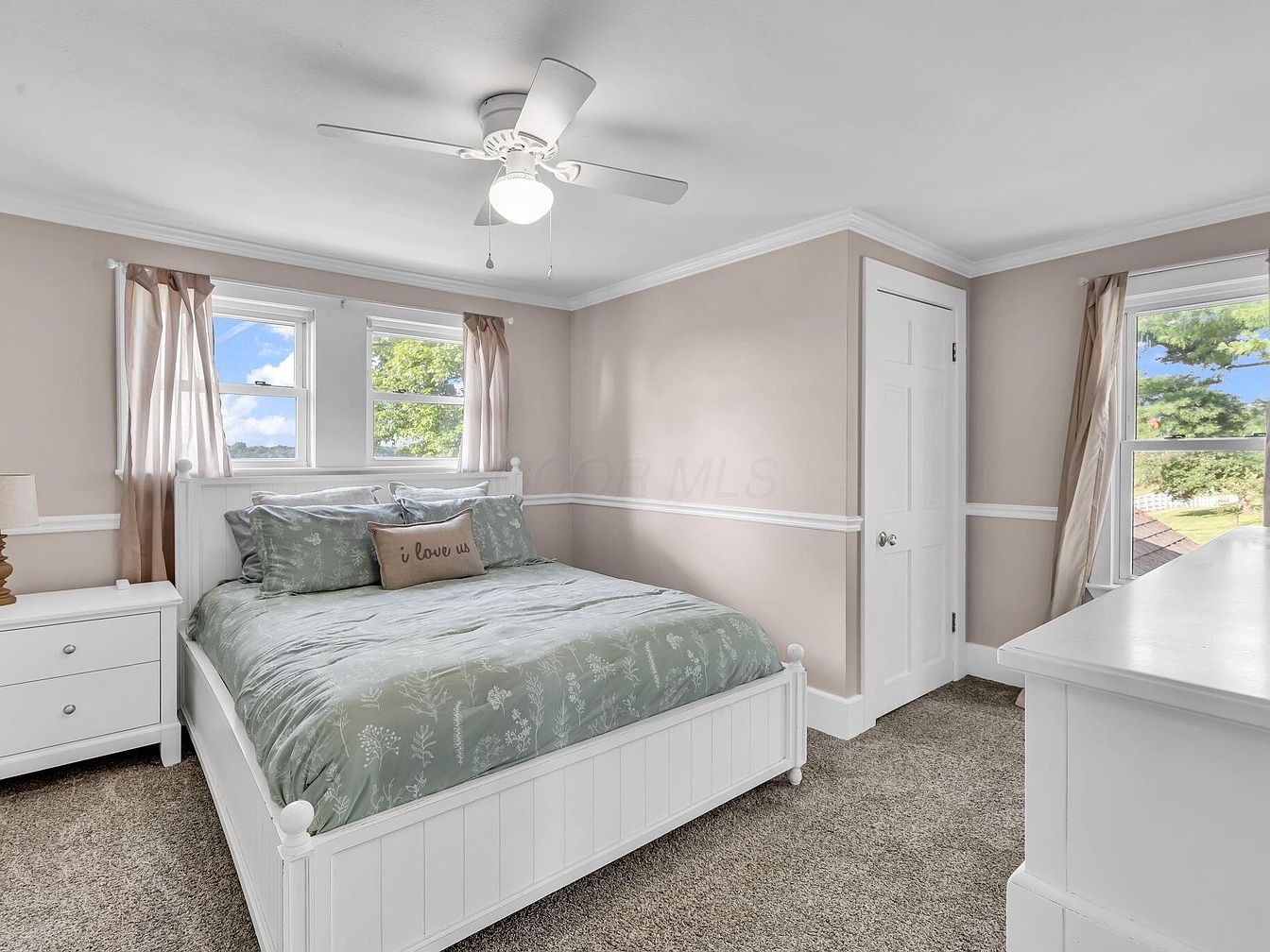 A cozy bedroom with beige walls, white crown molding, and soft, plush carpet in a warm neutral tone. The bed, centered along one wall beneath two bright windows, has a white wooden frame and is dressed in muted sage bedding decorated with delicate botanical patterns, complemented by a small decorative pillow with the words ‘i love us.’ Matching white nightstand on the left holds a simple lamp. Flowy taupe curtains frame the windows, letting in ample daylight that fills the room. Across from the bed sits a white dresser, and a small closet door is tucked into the corner. The space feels tranquil and welcoming.