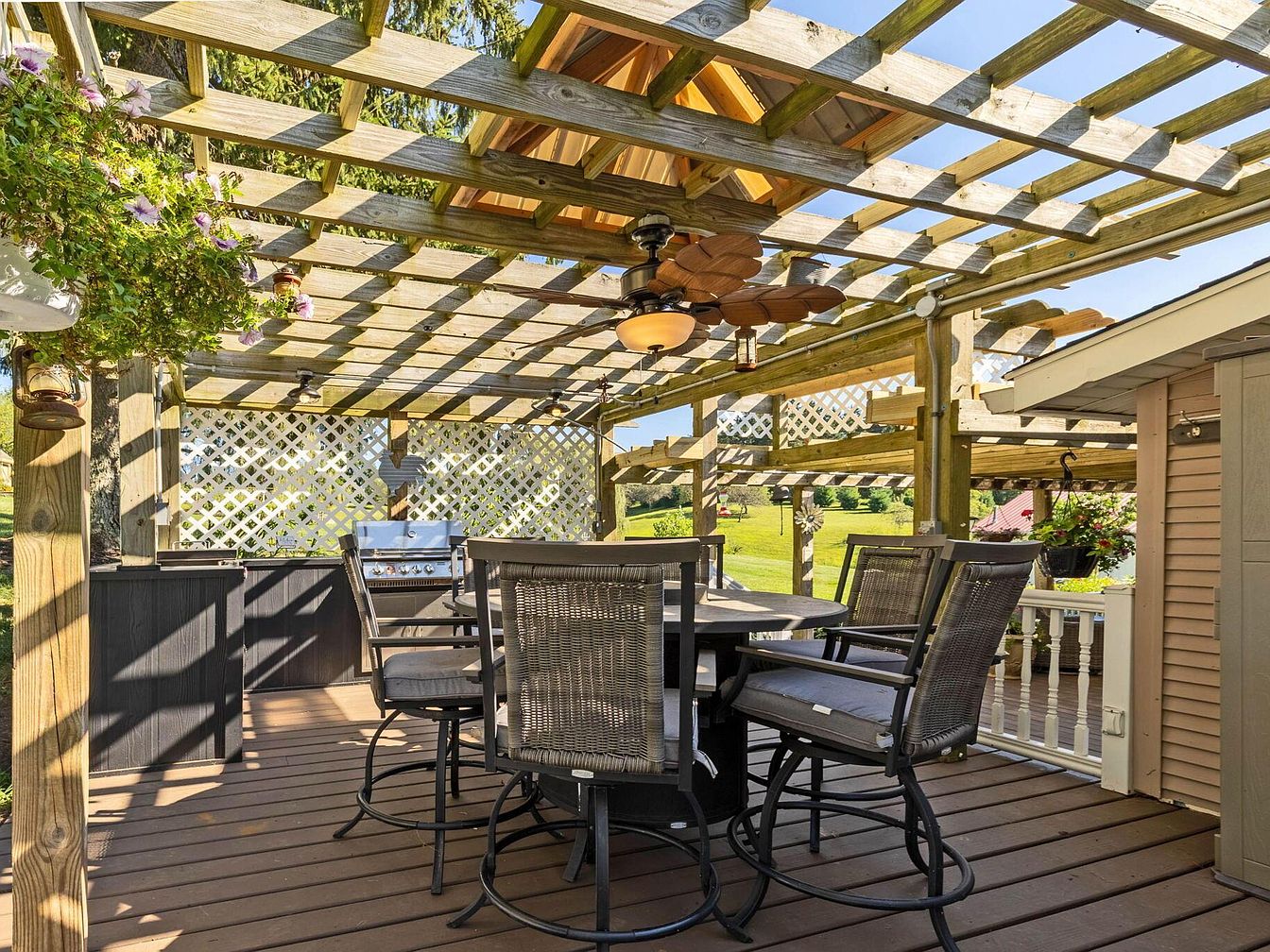A spacious outdoor patio features a wooden deck with a large round dining table surrounded by high-backed, cushioned bar stools. An open lattice pergola overhead casts geometric shadows and supports a ceiling fan with decorative leaf-like blades. The area is adorned with hanging flower baskets, adding color and a touch of nature. Along one side, a barbecue grill and dark cabinetry provide space for outdoor cooking. Lattice panels and wooden posts define the structure, while the backdrop of green lawns and gardens offers a peaceful countryside atmosphere, blending comfort and rustic elegance for outdoor gatherings.