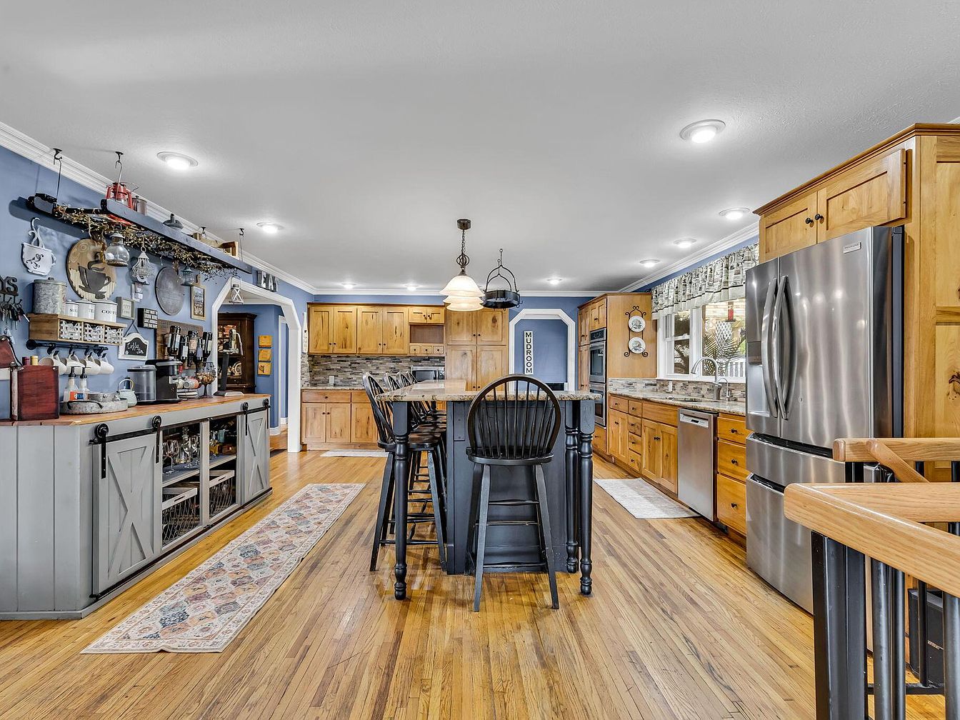Spacious kitchen with a warm, inviting atmosphere featuring a wooden floor and natural wood cabinets throughout. A large dark-toned island with matching high-backed chairs stands centrally, illuminated by pendant lighting overhead. The left side displays a coffee bar set up atop a rolling cabinet with sliding barn-style doors, ornamented with hanging cups, utensils, and eclectic wall decor against a medium blue backdrop. The stainless-steel refrigerator, dishwasher, and dual ovens add a modern touch. Sunlight enters through a window with a cheerful patterned valance above the sink, complementing the earthy granite countertops and rustic ambiance created by abundant natural materials and farmhouse accents.