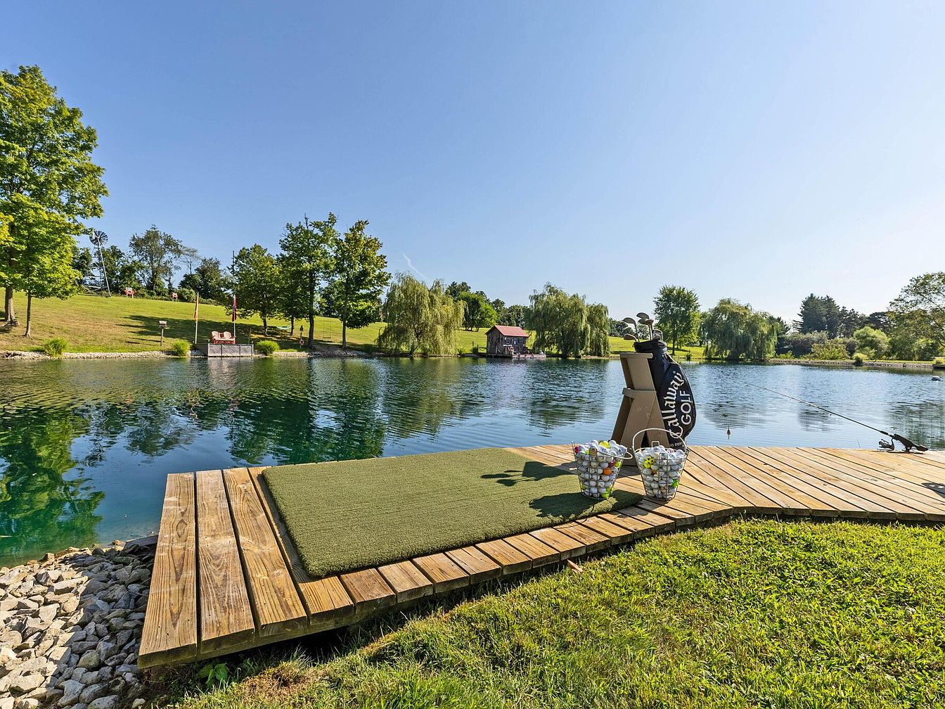 A wooden dock extends over a tranquil pond, outfitted with an artificial grass mat and a golf bag stand holding clubs and a branded golf bag. Two wire baskets overflow with golf balls, accentuating a playful, recreational setting. To the right, a fishing rod is propped at the dock’s edge, adding to the leisurely atmosphere. Sunlight reflects on the calm blue water, surrounded by manicured lawns and willow trees. The far shore features gathering areas with seating and a small structure, enhancing the serene, park-like landscape. The overall color scheme is vibrant with rich greens and deep blues.