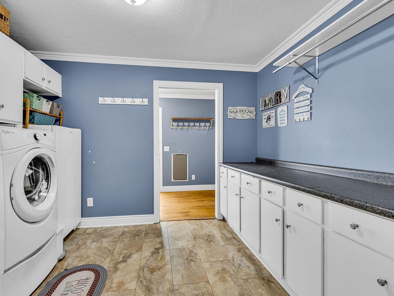 A functional laundry room with soft blue walls, white cabinetry, and a long dark countertop offering ample workspace. To the left, a white front-load washing machine is built in beneath overhead cabinets filled with baskets. Across from the washer, white lower cabinets line the wall with silver knobs and above them is a white shelf for hanging clothes. Decorative wall signs with laundry-themed phrases provide a charming touch, enhancing the space’s homey feel. The room has tan stone-patterned tile flooring, bright white crown molding, and a cozy rug near the washer, lending a tidy yet welcoming atmosphere. Natural light flows in from the doorway, connecting to another neatly organized area.