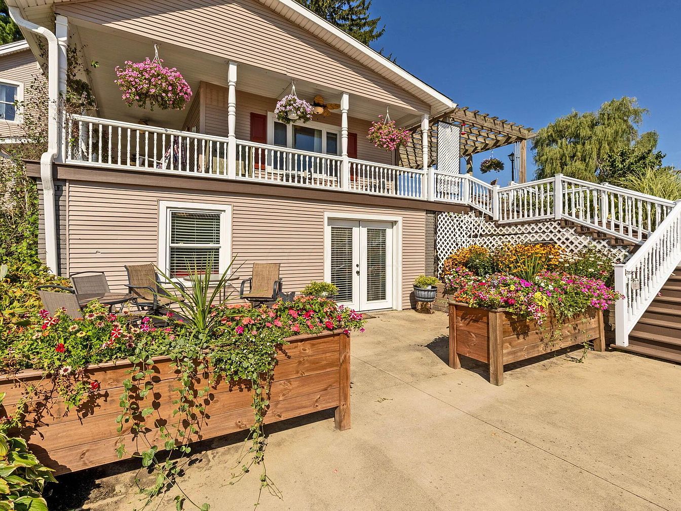 A spacious concrete patio sits on the lower level of the house, featuring several wooden planters brimming with vibrant, cascading pink and purple flowers. Four patio chairs are arranged for seating beside a large window with white trim. The upper level showcases a covered porch with white railings and columns, decorated with hanging flower baskets and ceiling fans. A red front door serves as a focal point, while a broad staircase with white balustrades leads up to the porch. Latticework and a pergola add architectural interest, and mature greenery surrounds the area, enhancing the relaxed and inviting outdoor setting.