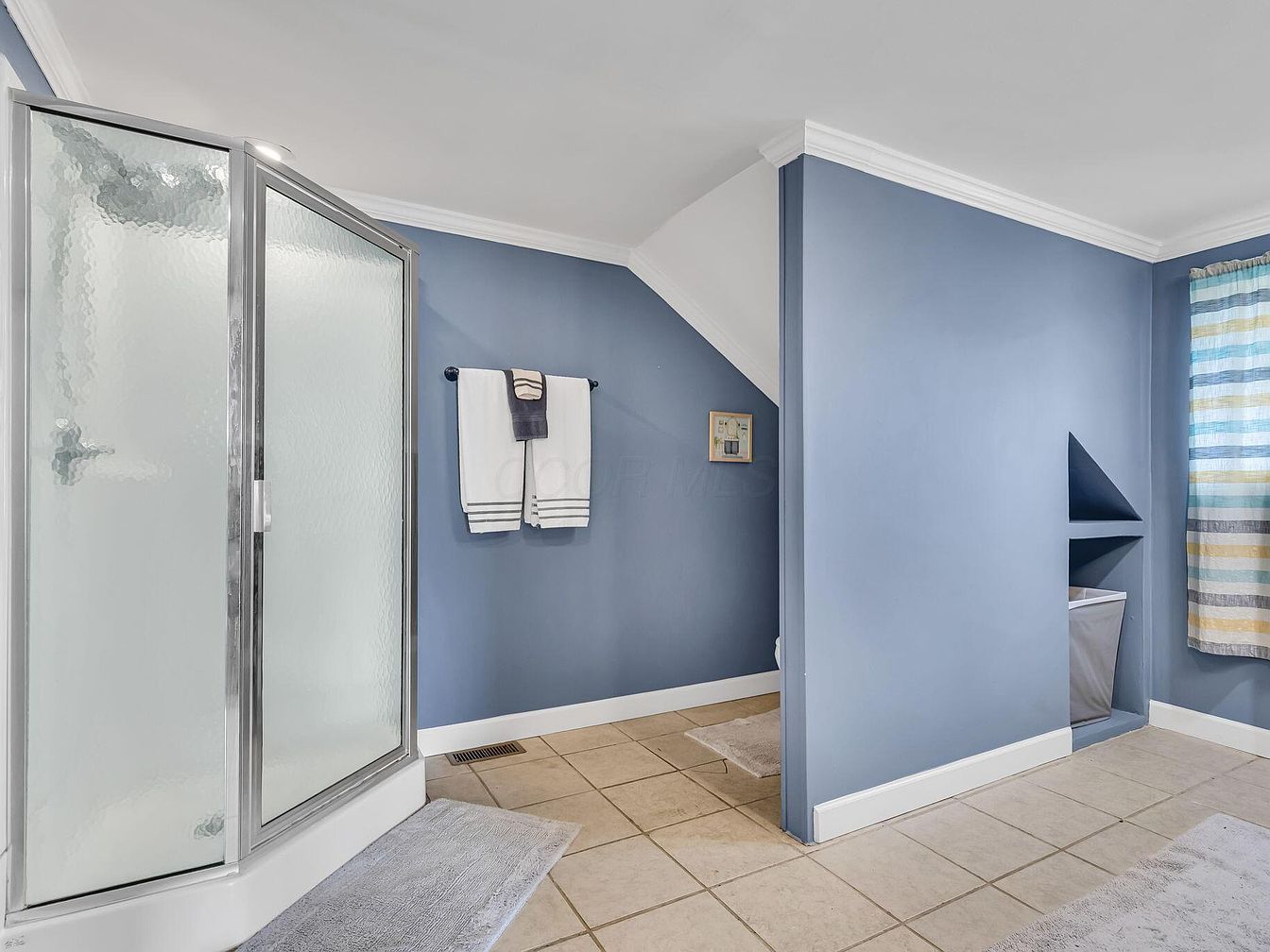 Spacious bathroom featuring calm blue walls with crisp white crown molding that adds to the clean and airy feel of the space. The flooring is composed of large beige ceramic tiles, offering a neutral base. A corner glass shower with frosted panels and sleek chrome framing sits to the left, accompanied by a soft gray bathmat. Two fluffy white towels with gray decorative borders hang on a dark rack, accompanied by a smaller accent towel. One wall includes open shelving with a laundry hamper below, adjacent to a window dressed with multicolored striped curtains, bringing a subtle touch of color and warmth.