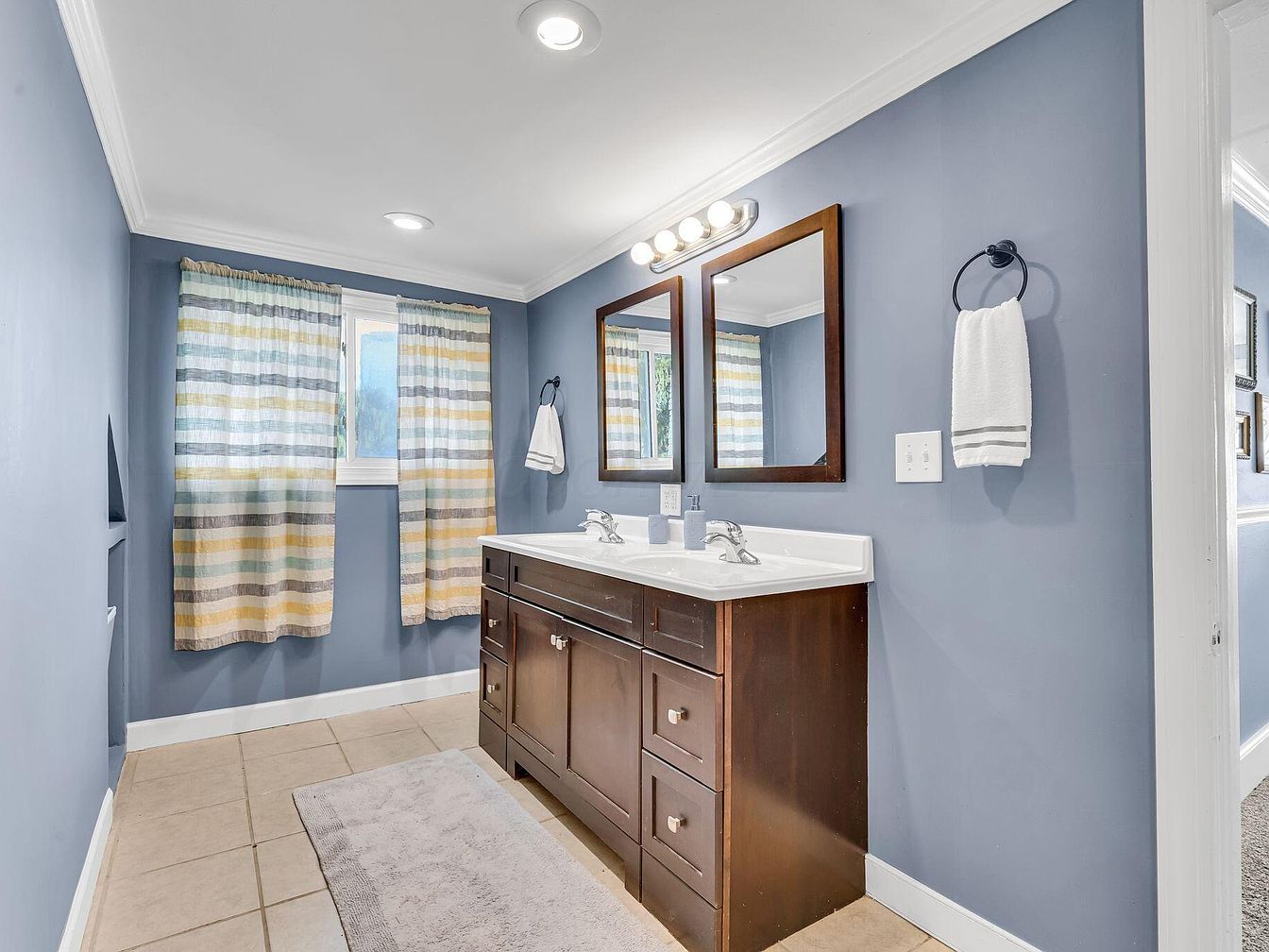 A spacious bathroom with a double-sink vanity featuring a dark wood cabinet and two rectangular mirrors framed in a matching finish. The walls are painted a muted periwinkle blue, complemented by crisp white baseboards and crown molding. Recessed ceiling lights and a row of bulb lights above the mirrors provide ample illumination. A window with striped curtains in soft yellow, blue, gray, and white lets in natural light. Beige ceramic tiles cover the floor, and a plush light gray rug lies in front of the vanity. Minimalist towel rings, each with a neatly folded white towel, add functional detail.