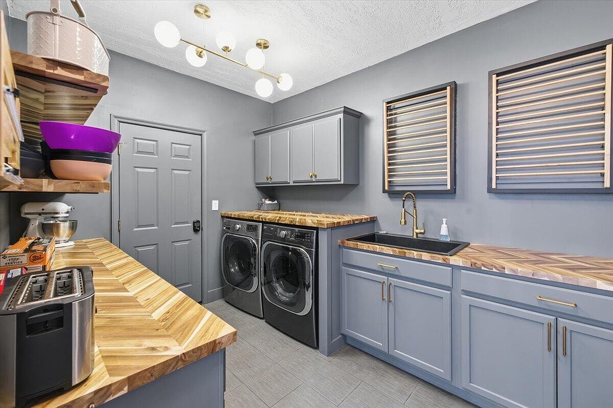 This laundry room features a modern design with a sleek color palette of gray tones accented by warm wooden elements. The walls are adorned with soft gray paint, enhancing the peaceful ambiance. Two high-efficiency black washers sit beneath a striking wooden countertop, showcasing a chevron pattern for visual interest. Above, gray cabinets offer ample storage, complemented by stylish gold hardware. Unique wooden blinds frame the windows, allowing diffused light while maintaining privacy. A chic, gold faucet elegantly juxtaposes the dark sink, blending functionality with style. The room harmonizes practicality with contemporary aesthetics.