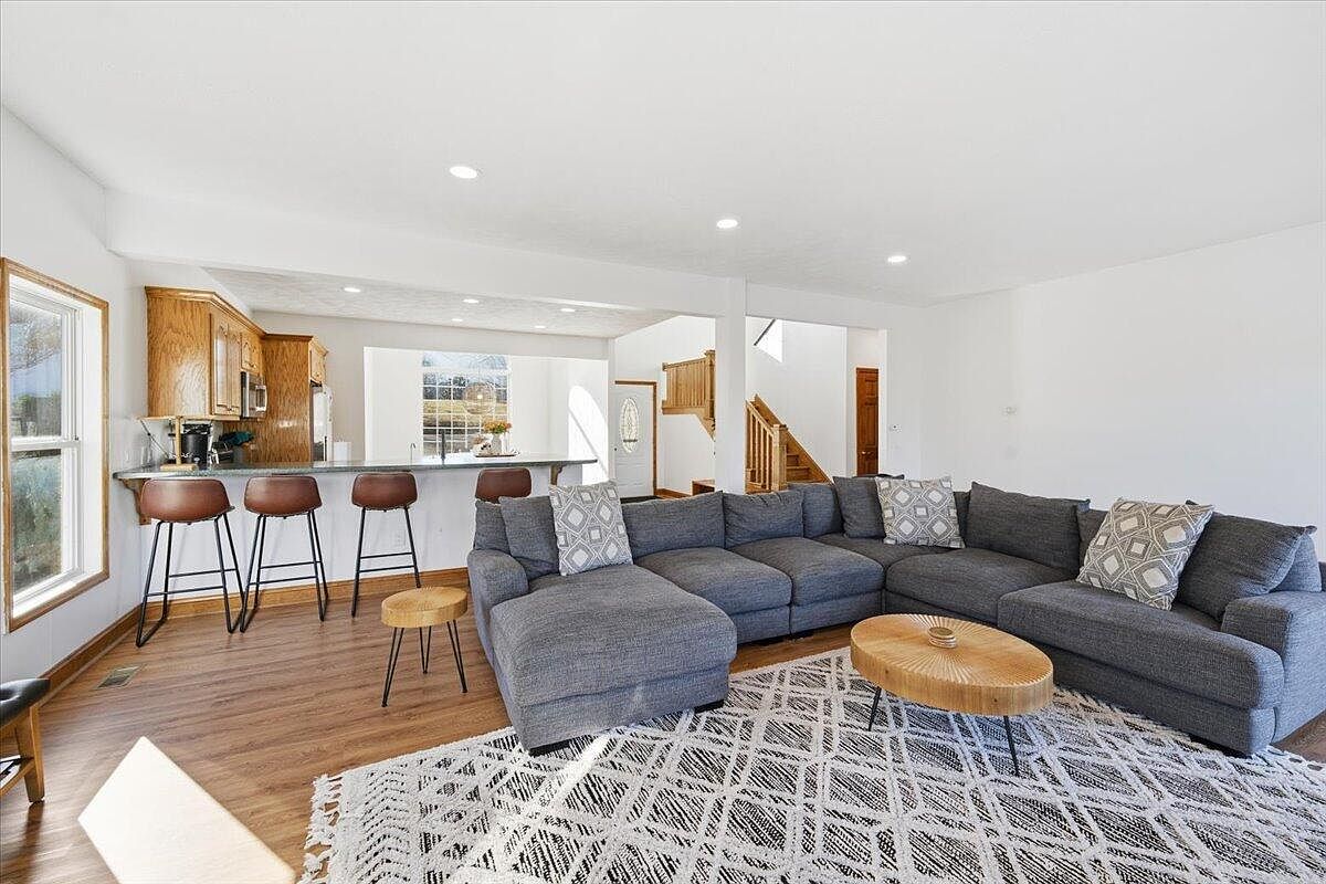 This spacious living room features a large sectional couch adorned with patterned throw pillows, inviting comfort and relaxation. The floor is covered with a textured area rug that showcases a modern geometric design, enhancing the room’s aesthetic. A round wooden coffee table with a natural finish adds warmth to the space. Behind the couch, a sleek breakfast bar equipped with high, brown stools leads to a kitchen with rich wooden cabinetry and stainless steel appliances. The room is filled with natural light from large windows, while a staircase with wooden railings provides access to the upper levels of the home.