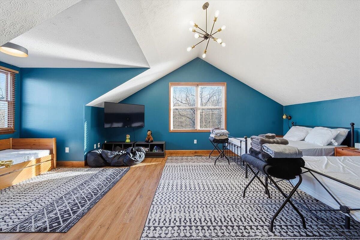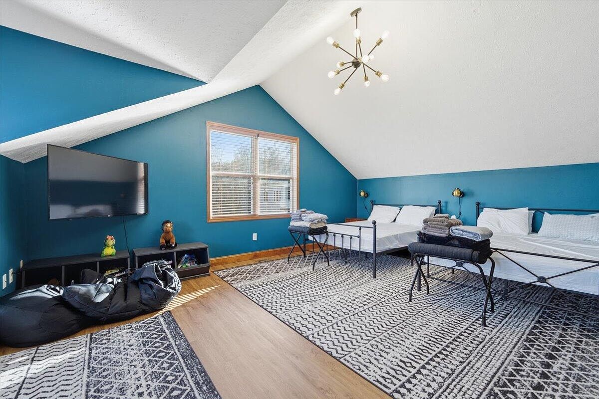 A spacious bedroom featuring a striking deep teal accent wall contrasted by the bright, sloped ceiling. Natural light floods in through a large window adorned with wooden frames. A sleek black television hangs opposite a cozy setup, including a pair of beds with neatly arranged linens and pillows. The floor is highlighted by patterned area rugs that add a touch of texture. Different tones of gray blankets are thoughtfully stacked on a bench near one bed. A modern chandelier with exposed bulbs adds a stylish focal point to the room, enhancing its inviting, contemporary atmosphere.