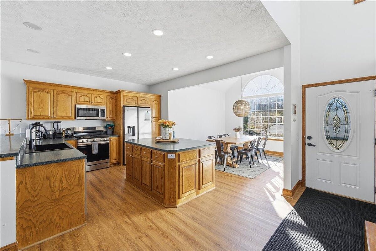 This kitchen features a spacious layout with warm wood cabinetry and sleek black countertops. The island at the center provides additional space for meal preparation and casual dining. Stainless steel appliances, including an oven and refrigerator, integrate modern convenience. Adjacent to the cooking area, a dining space boasts a large window, flooding the room with natural light. A round pendant light hangs over the table, accentuating the modern aesthetic, complemented by black metal chairs. The flooring is a light-colored wood, enhancing the open and airy feel, while decor elements like a floral arrangement bring a touch of warmth.