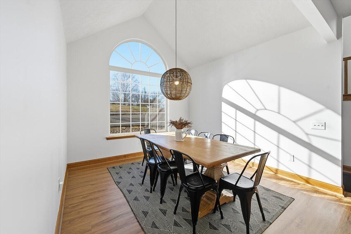 This dining area features a spacious wooden table surrounded by metal chairs, creating a rustic yet modern ambiance. Large, arched windows let in ample natural light, showcasing the scenic outdoor view while illuminating the space. The walls are painted in a clean white, emphasizing simplicity and brightness, complemented by warm wood tones in the flooring and trim. A stylish woven pendant light hangs above the table, adding texture and interest. A patterned area rug under the table delineates the space and adds a touch of coziness, enhancing the inviting atmosphere for gatherings and meals.