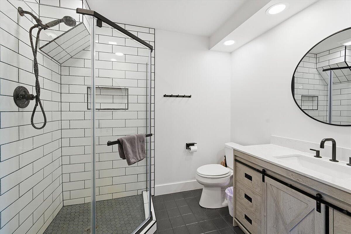 A sleek bathroom layout features a spacious shower enclosed by glass. The shower showcases classic white subway tiles accented by a textured black trim. A rain shower head and a handheld option create a luxurious experience. Beneath the oval mirror, a dual-sink vanity with a crisp white countertop provides functionality, framed by rustic wood cabinetry that introduces warmth through its natural finish. The room’s color palette is neutral, highlighted by the contrast of dark hexagonal floor tiles. A towel rack and functional accessories blend seamlessly into the design, ensuring practicality without compromising style.