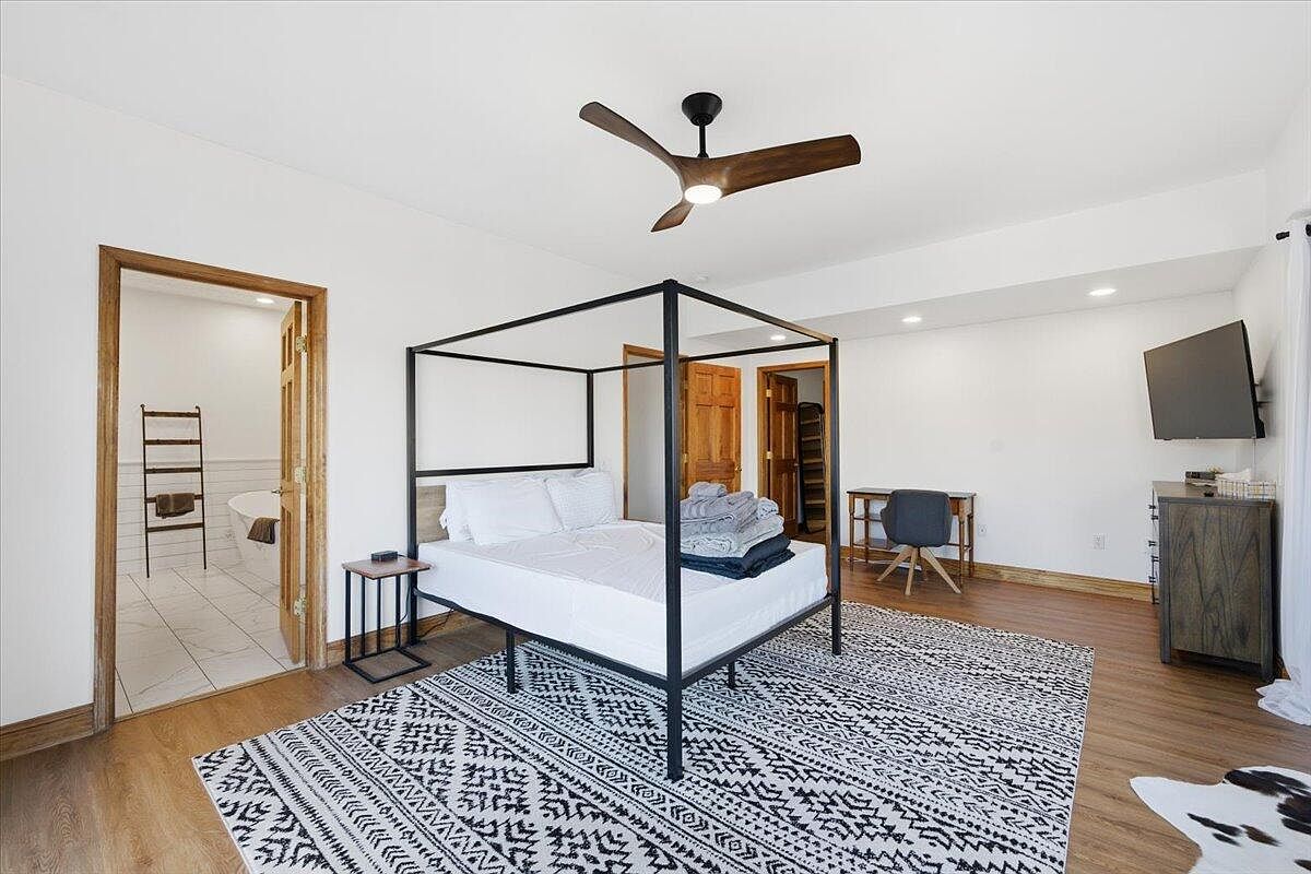 This spacious bedroom features a modern black metal canopy bed, layered with neatly arranged towels. A patterned black and white rug grounds the space, contrasting with the warm wood flooring. Natural light floods in, highlighting the crisp white walls and ceiling. The room includes a sleek wooden nightstand with a phone charger, while a minimalist desk and chair provide a functional workspace. The entrance to a stylish bathroom is framed by an ornate door, adding architectural interest. Decorative elements like a ladder rack and mounted TV blend functionality with contemporary aesthetics, creating a serene atmosphere.