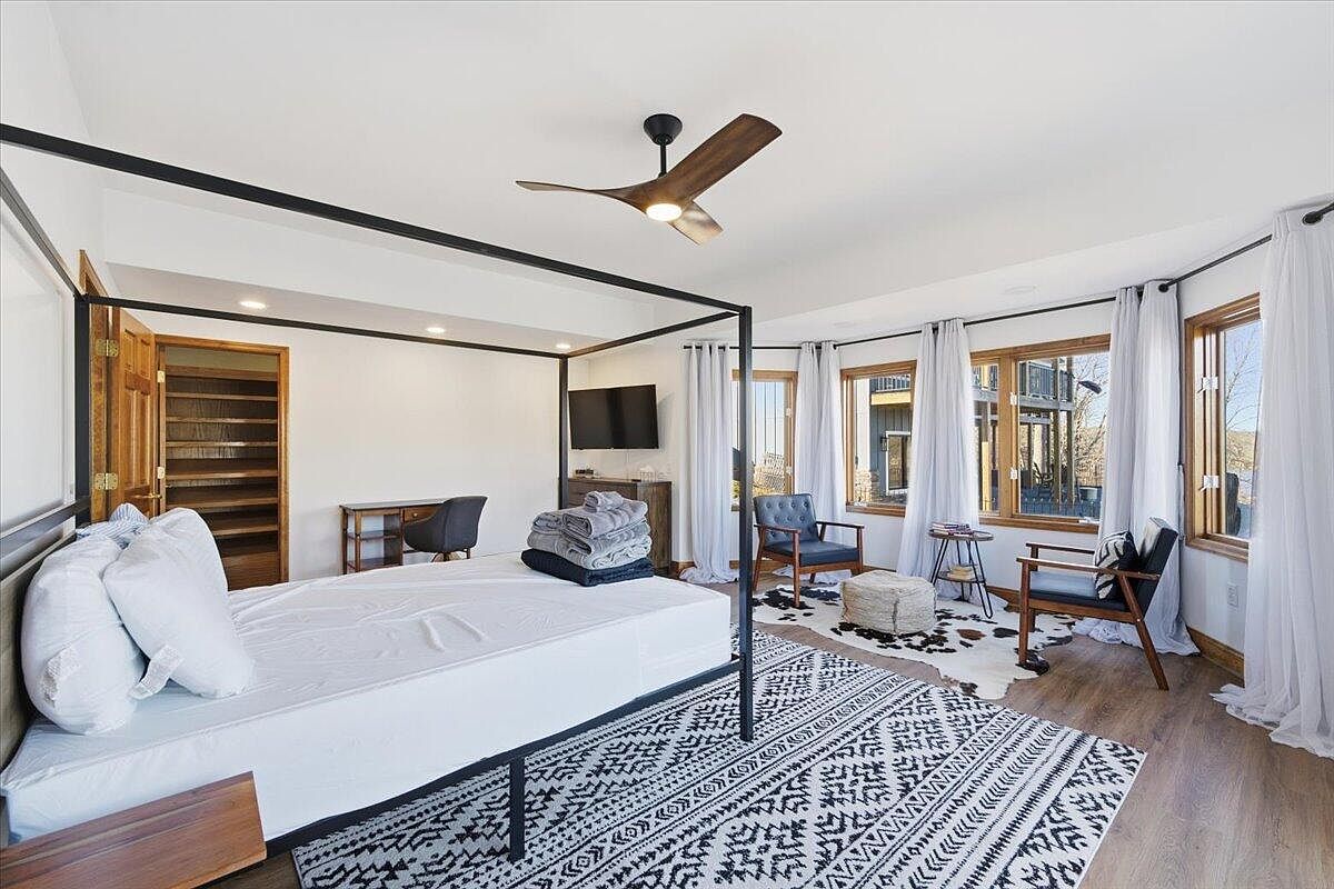 This bedroom features a sleek black four-poster bed positioned prominently, with an unmade white mattress layered with neatly stacked gray towels. The walls are predominantly white, enhancing the room’s spaciousness. Natural wood accents adorn the windows and door, providing warmth. A modern ceiling fan with a stylish blade adds a contemporary touch. The floor showcases a striking black-and-white patterned area rug, complementing the minimalist furnishings, including a wooden desk and two comfortable chairs. Sunlight streams through large windows, illuminating the space, while soft, flowing curtains gently frame the views, creating an inviting, serene ambiance.