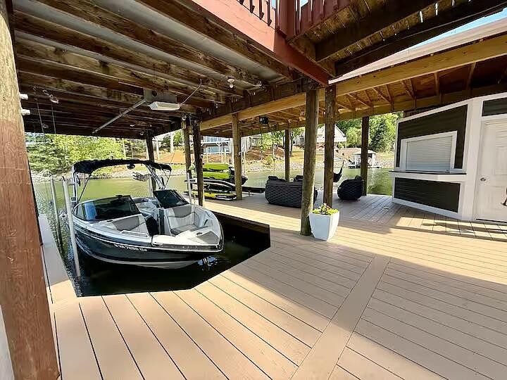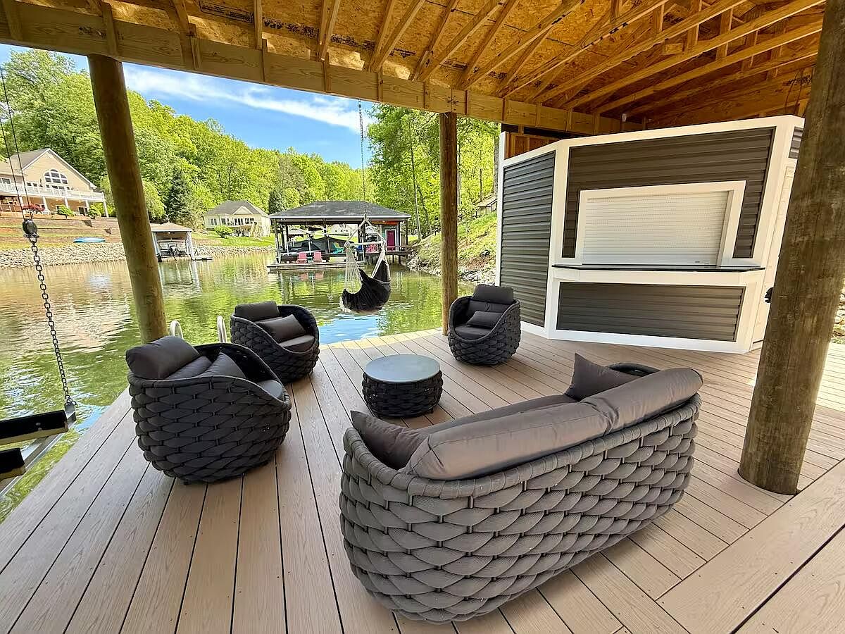 An inviting boat dock space featuring a sleek motorboat nestled comfortably on the water. Wooden posts support the overhead structure, lending a rustic charm. The deck is adorned with composite flooring, showing light brown tones that harmonize with the natural setting. To the right, comfortable seating areas with dark wicker furniture provide a casual gathering spot, framed by vibrant greenery in planters. The subtle play of sunlight reflects off the water, enhancing the serene atmosphere. A small service area is visible, equipped with a door and windows, blending functionality into the stylish lakeside retreat.