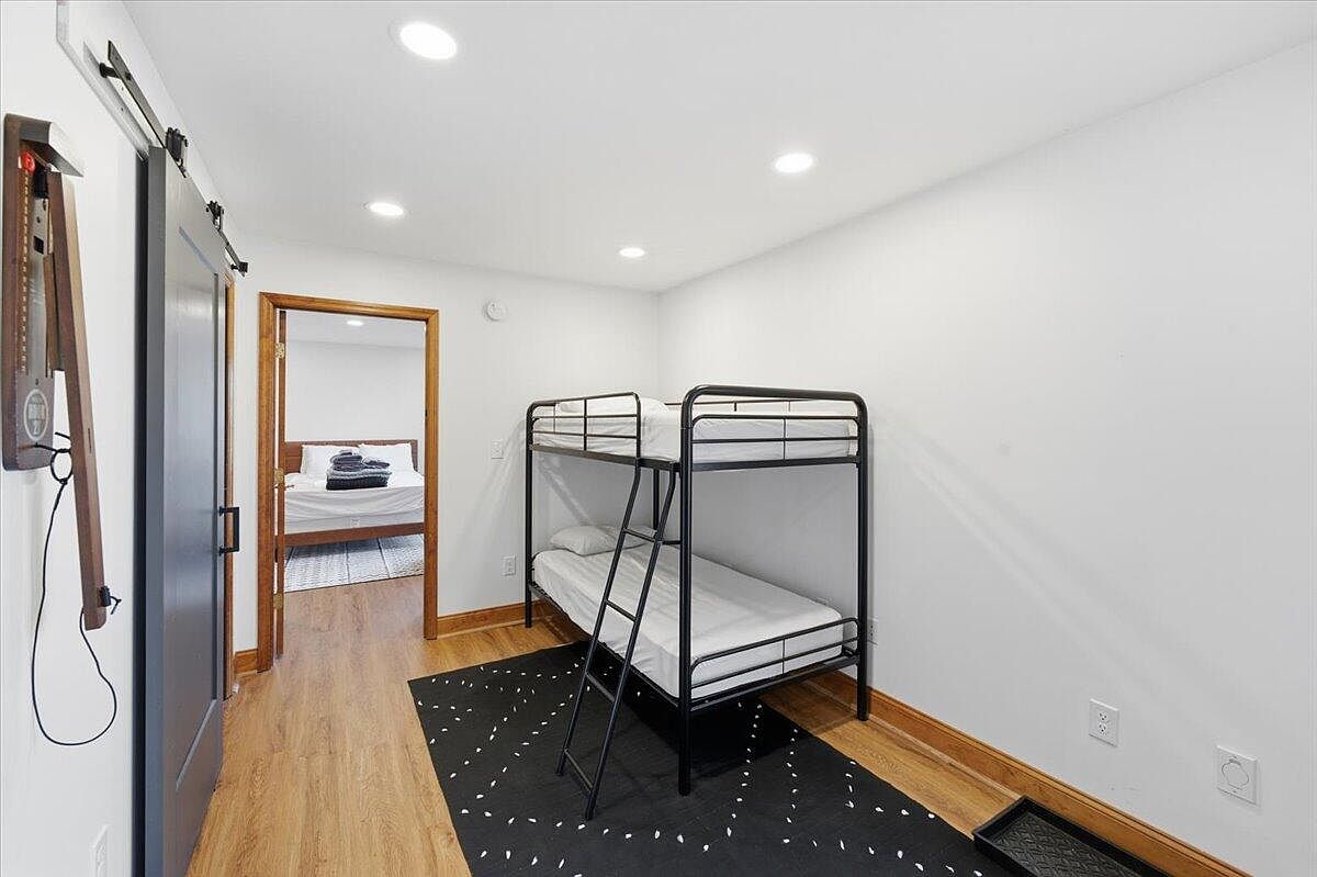 This children’s bedroom features a practical layout with a bunk bed positioned against a clean, white wall. The black metal frame of the bunk bed contrasts nicely with the warm wood flooring, adding a modern touch. A patterned area rug, predominantly black and white, grounds the space and provides a soft area for play. Recessed lighting brightens the room effectively, enhancing the minimalist aesthetic. A doorway leads to another bedroom, suggesting a connectedness in the layout. Nearby, a dark sliding barn door adds a rustic charm while the light-colored walls keep the room feeling spacious and airy.