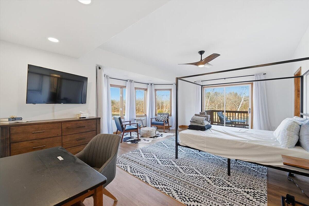 This spacious bedroom features a minimalist design with a prominent four-poster bed framed in dark metal, lacking bedding. The color palette is light, dominated by white walls and rich wooden accents. A large flat-screen TV is mounted on a low dresser made of dark wood. To one side, a cozy study area includes a modern grey chair paired with a small black desk. Natural light floods in from expansive windows framed with sheer white curtains, offering serene views of trees outside. A black and white patterned rug anchors the space, adding texture and warmth underneath the furniture.