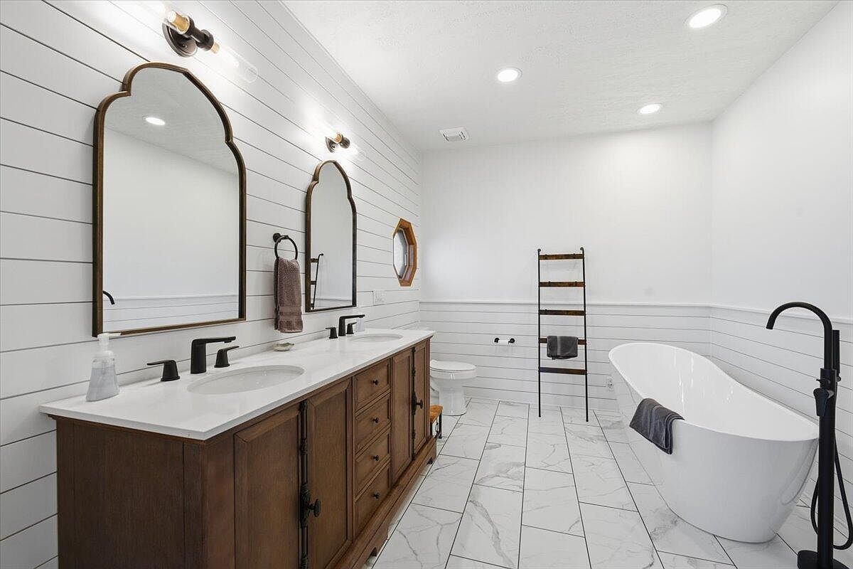 Modern bathroom featuring a spacious layout with white shiplap walls and ample natural light. A double vanity made of rich wood provides warmth, complemented by sleek white countertops. Two elegantly shaped mirrors, framed in dark metal, add sophistication. Black faucets and hardware create a striking contrast against the light backdrop. A standalone, modern freestanding tub sits invitingly, draped with a dark towel. A wooden ladder rack offers an aesthetic touch while holding towels. The floor is adorned with large, light-colored tiles, enhancing the room’s spaciousness and brightness, contributing to a serene, spa-like atmosphere.