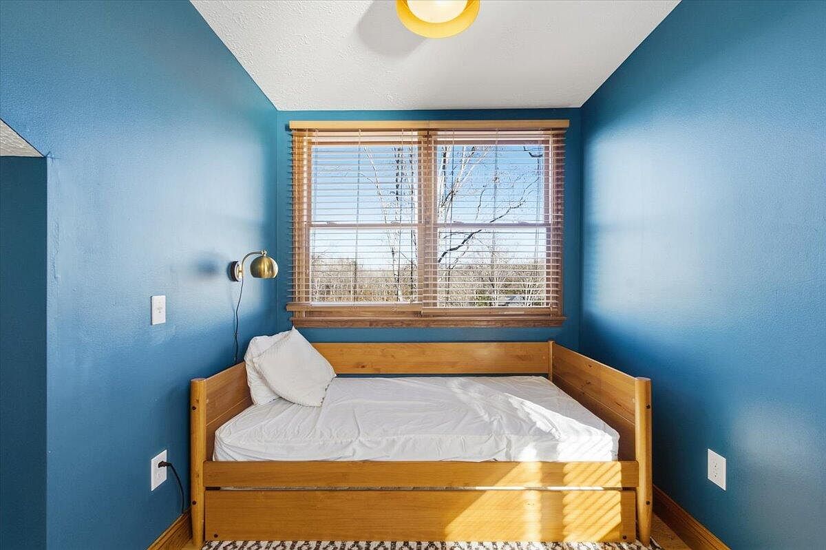 This cozy child’s bedroom features a rich blue-painted wall that adds depth and character. A simple wooden bed with a minimalist design occupies one corner, complemented by a plush pillow. Beneath the bed, a textured area rug introduces warmth and a playful pattern, enhancing the room’s charm. An elegant golden bedside lamp casts a soft glow, perfect for reading at night. Natural light floods through the large window, adorned with wooden blinds, framing a scenic view of trees outside. The overall aesthetic is inviting, promoting a sense of comfort and tranquility for relaxation or play.