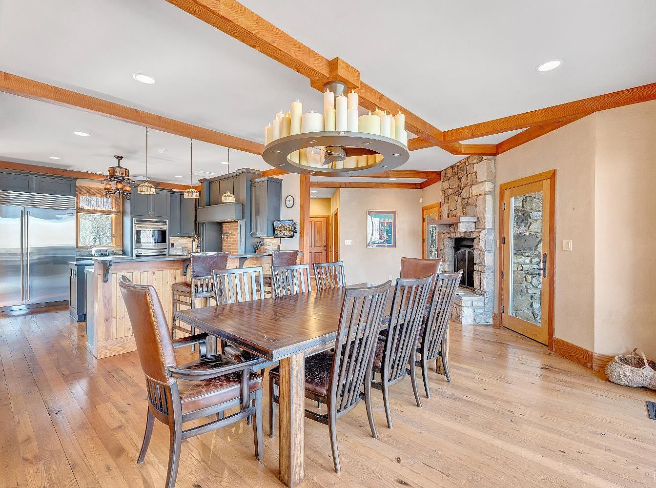 The dining area features a large, rich wooden table surrounded by matching chairs with dark leather seats, creating an inviting space for gatherings. Above, a modern chandelier with cylindrical candles hangs from the ceiling, complementing the warm wood tones present in the exposed beams. The room is illuminated with natural light filtering through large windows, enhancing the warm hues of the hardwood flooring. To the left, a sleek kitchen visible through an open layout boasts dark cabinetry and stainless steel appliances, creating a contemporary contrast to the rustic dining area. A stone fireplace adds a cozy touch.