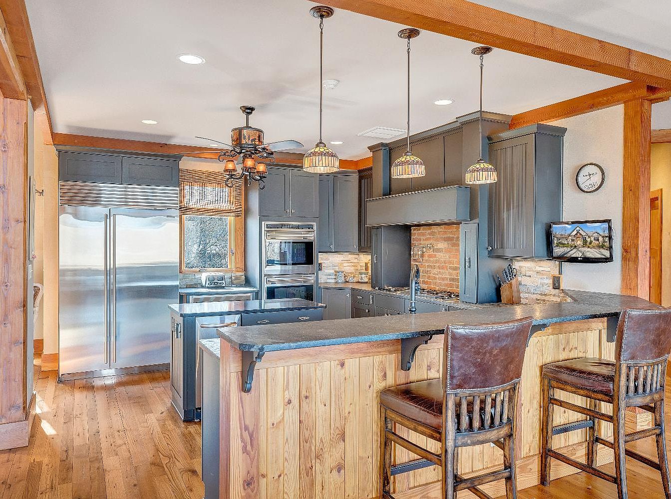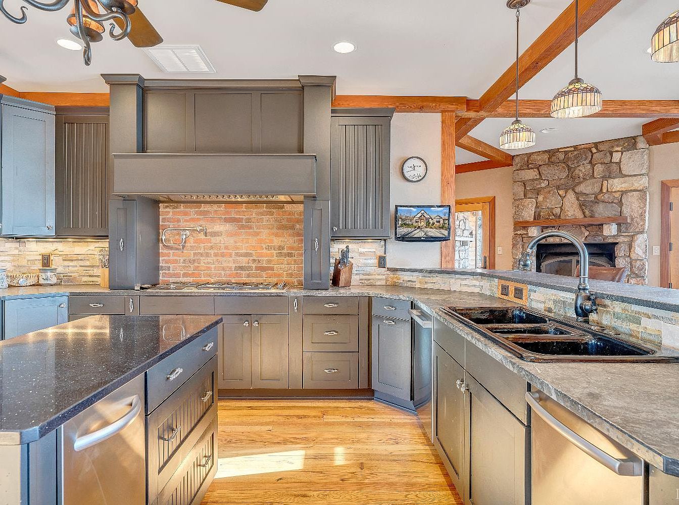 This kitchen showcases a contemporary yet rustic aesthetic, featuring dark gray cabinetry paired with sleek, dark countertops. A prominent brick backsplash adds texture, contrasting with the smooth granite surfaces. The room has a functional layout, with ample counter space for meal preparation and stainless steel appliances that enhance modernity. Exposed wooden beams grace the ceiling, adding warmth and character. Pendant lights hang above the island, providing focused lighting while adding decorative charm. An adjacent stone fireplace serves as a striking feature, integrating comfort into the cooking space, and large windows allow natural light to flood the room.