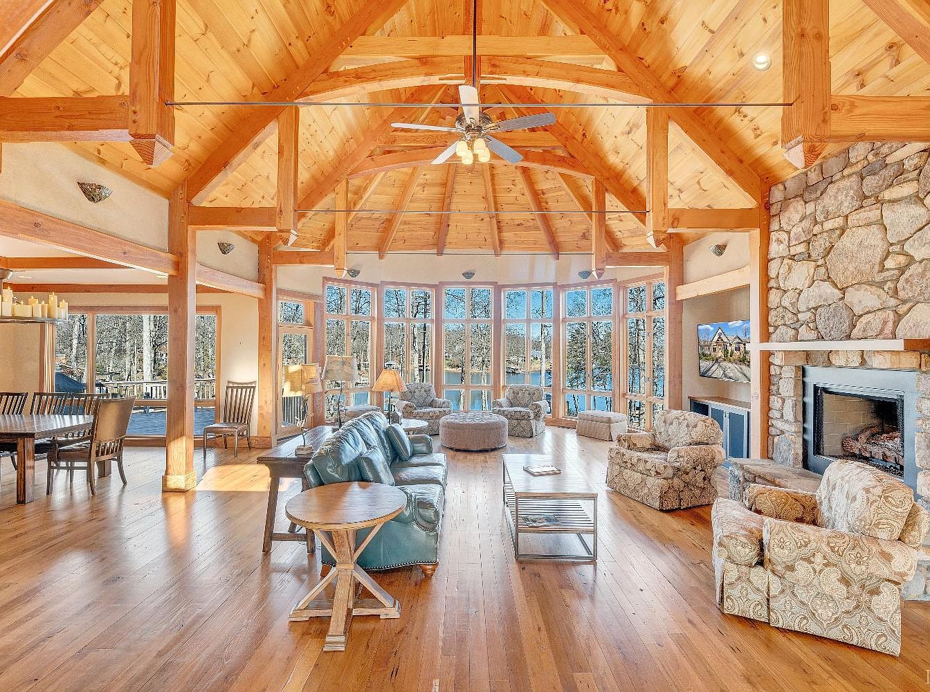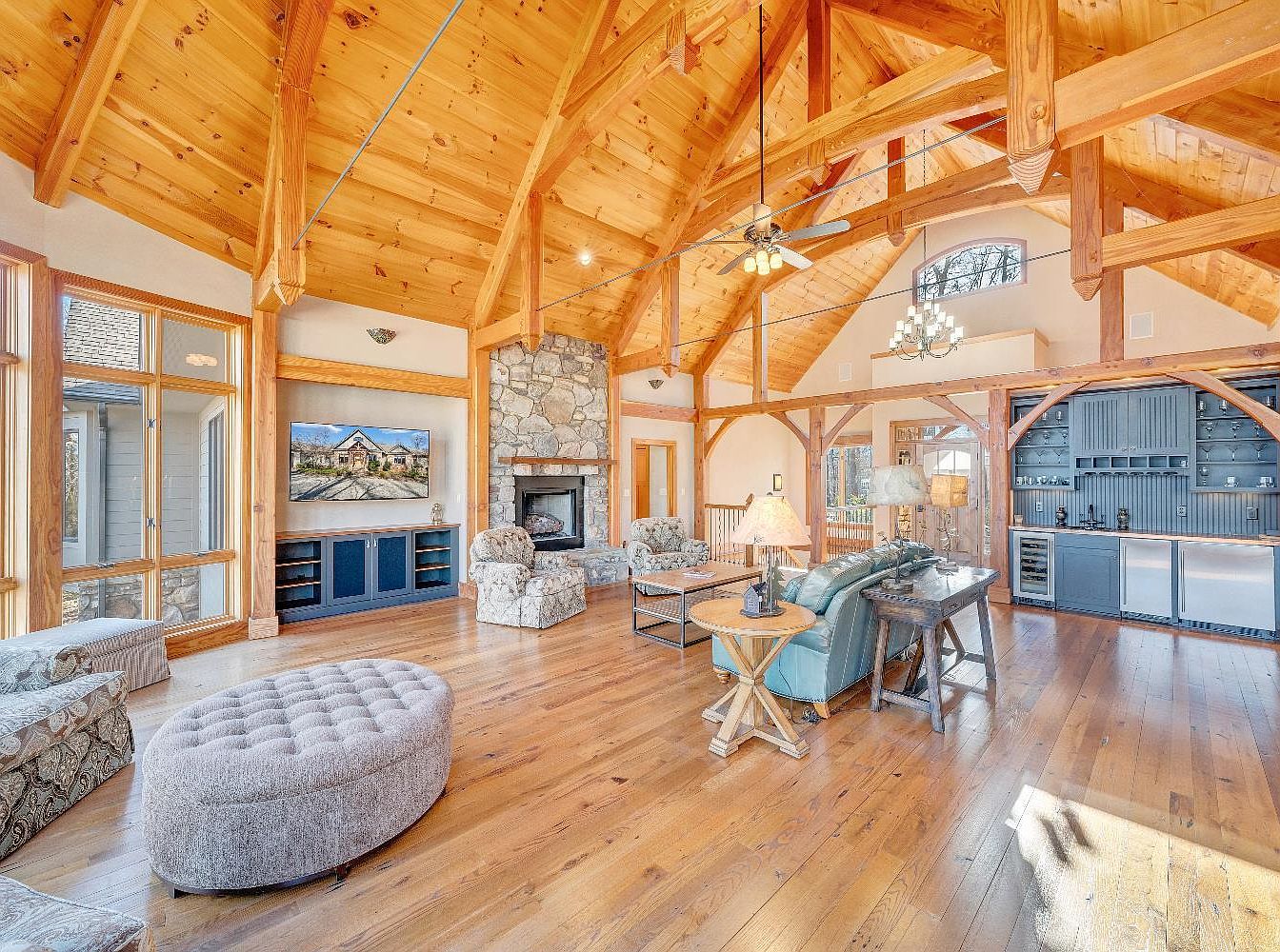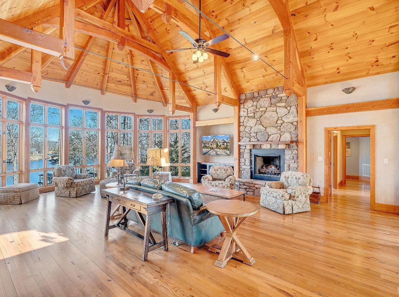 This spacious living room features a stunning vaulted ceiling, showcasing exposed wooden beams and a warm wood finish. The walls are framed by expansive windows that invite natural light, highlighting the rich, honey-toned hardwood floors. A cozy stone fireplace forms a focal point against one wall, complemented by casual seating including two upholstered armchairs and a plush ottoman. The room is anchored by a tasteful coffee table and illuminated by a ceiling fan and a side lamp. Color accents in soft blues and neutral tones create a welcoming atmosphere, ideal for relaxation or entertaining.