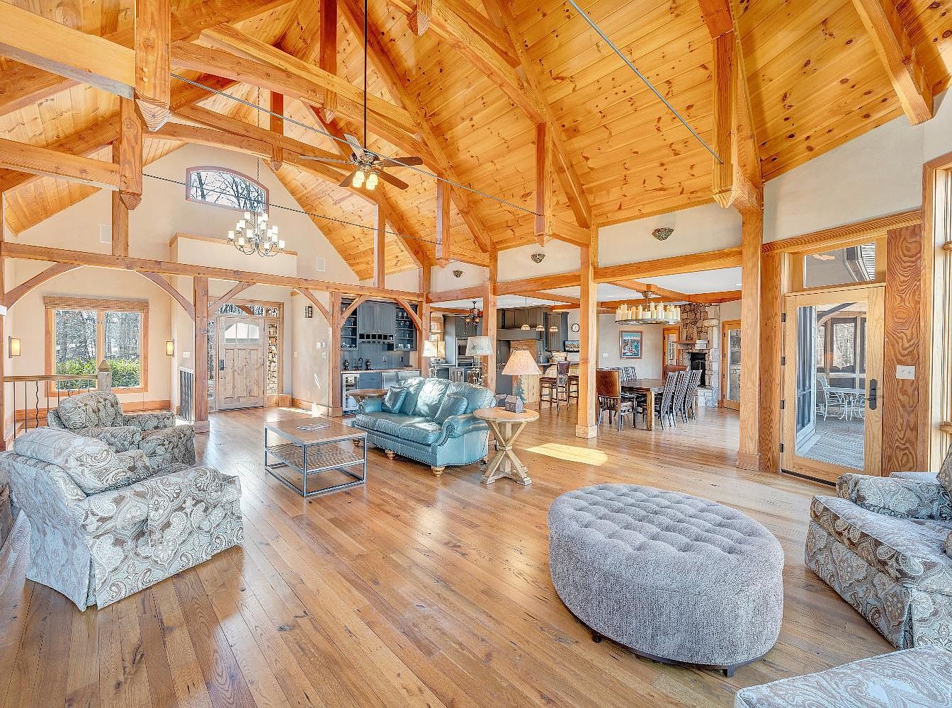 A spacious living room featuring high, vaulted ceilings adorned with warm wooden beams. The rich wood flooring complements natural light pouring in from large windows, creating an inviting, airy atmosphere. A cozy teal couch and a patterned armchair are positioned around a glass-topped coffee table. The room is accented by a plush, round gray ottoman and a wooden side table with a lamp, enhancing comfort. A rustic stone fireplace adds a touch of charm, while a dining area is visible in the background, featuring dark wooden furniture that contrasts beautifully with the lightness of the room.