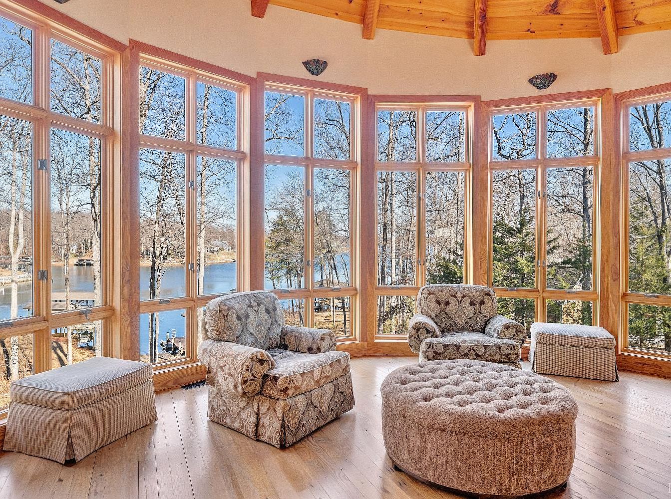 This sunroom features a unique circular layout with expansive windows that allow ample natural light and picturesque views of a serene lake. The wooden frame complements the soft, neutral color palette, creating a warm and inviting ambiance. Stylish upholstery adorns the plush armchairs, while a round tufted ottoman serves as a focal point in the center. A simple woven bench provides additional seating. The polished wooden floor enhances the rustic charm, harmonizing seamlessly with the natural surroundings. This cozy space is perfect for relaxation and enjoying the outdoors from the comfort of home.