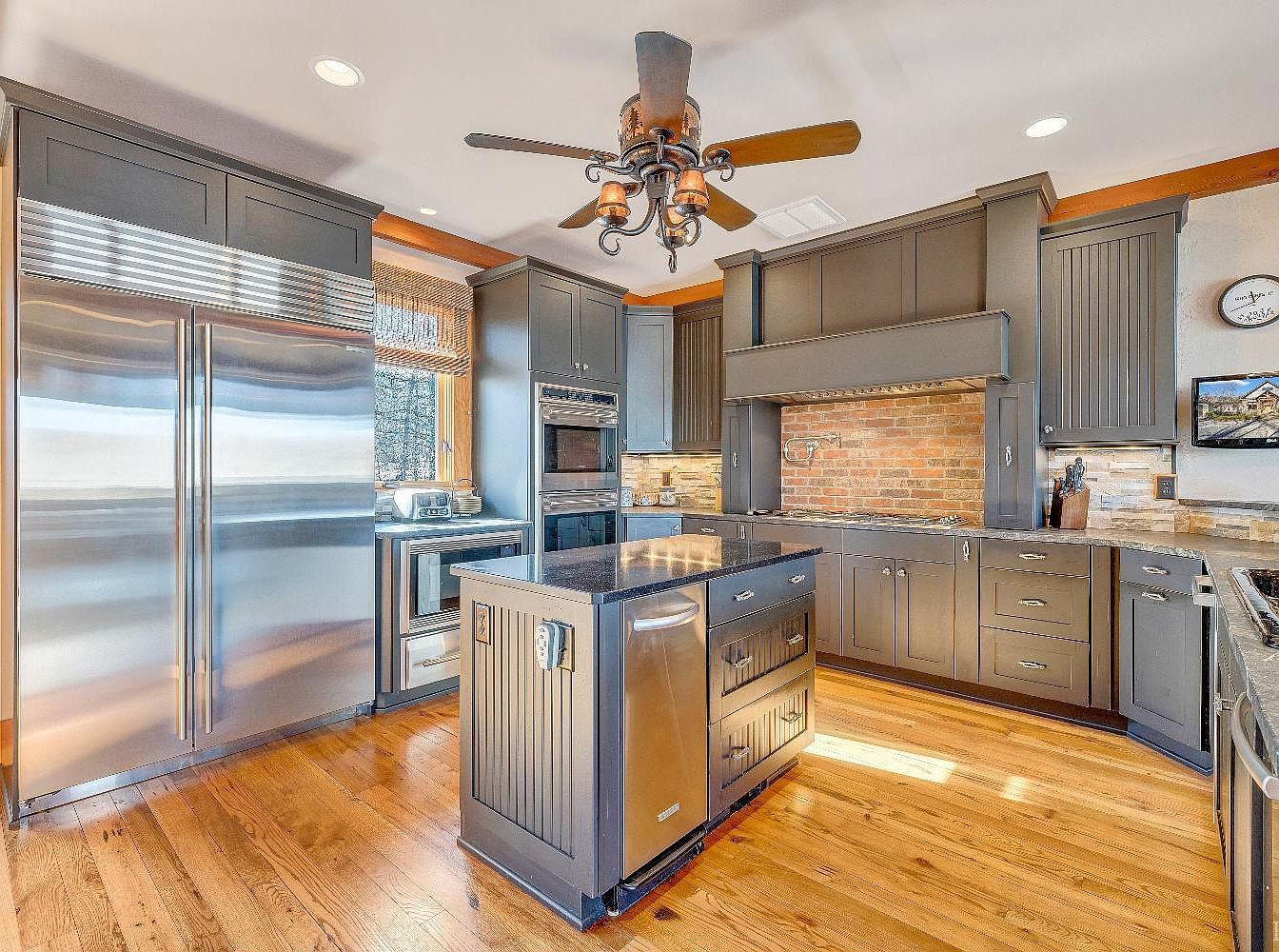 This kitchen features sleek, stainless steel appliances that contrast with the rich, dark cabinetry. A central island with a contrasting countertop, complemented by vertical beadboard detailing, serves as the focal point. Wall cabinets reach up to the ceiling, maximizing storage. Exposed brick highlights the cooking area, enhancing the rustic charm against modern fixtures. The warm wooden flooring adds warmth, while natural light filters through a window framed with woven shades. A classic ceiling fan with amber glass lights complements the earthy color palette, creating a cozy yet functional atmosphere perfect for both cooking and gathering.