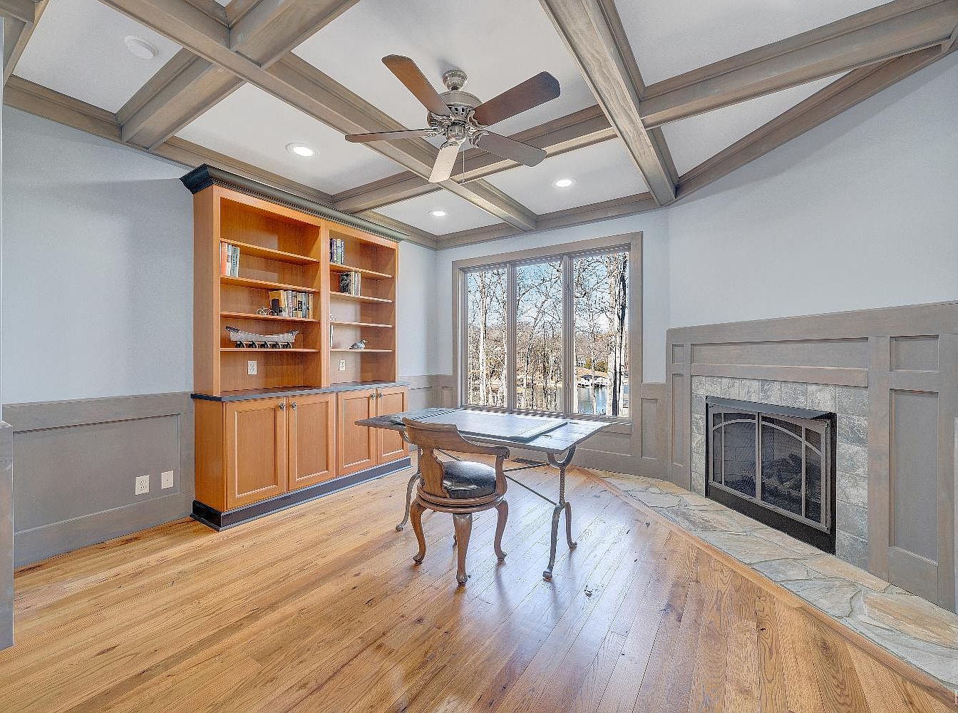 This cozy study features a warm, inviting layout with a rich wooden floor. The focal point is a classic wooden desk paired with a stylish chair, providing a functional workspace. A built-in bookshelf in the warm-hued wooden cabinetry showcases books and decorative items, enhancing the room’s intellectual charm. Above, intricate coffered ceiling beams add architectural interest, complemented by soft recessed lighting. Large windows bathe the room in natural light, offering serene views of the outdoors. A well-placed fireplace adds a touch of warmth, making this space perfect for reflection or productivity.
