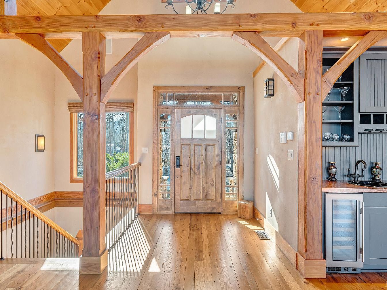 This entryway features exposed wooden beams and a vaulted ceiling, creating an inviting atmosphere. The warm, honey-toned hardwood floor complements the natural, earthy tones of the walls. A large wooden front door with decorative glass panels serves as a focal point, flanked by two cozy windows with soft shades that allow natural light to filter in. To the right, a sleek built-in cabinet houses glassware, emphasizing a blend of functionality and style. The wrought iron railing on the staircase adds an elegant touch while ensuring safety. Overall, the design combines rustic charm with modern aesthetics.