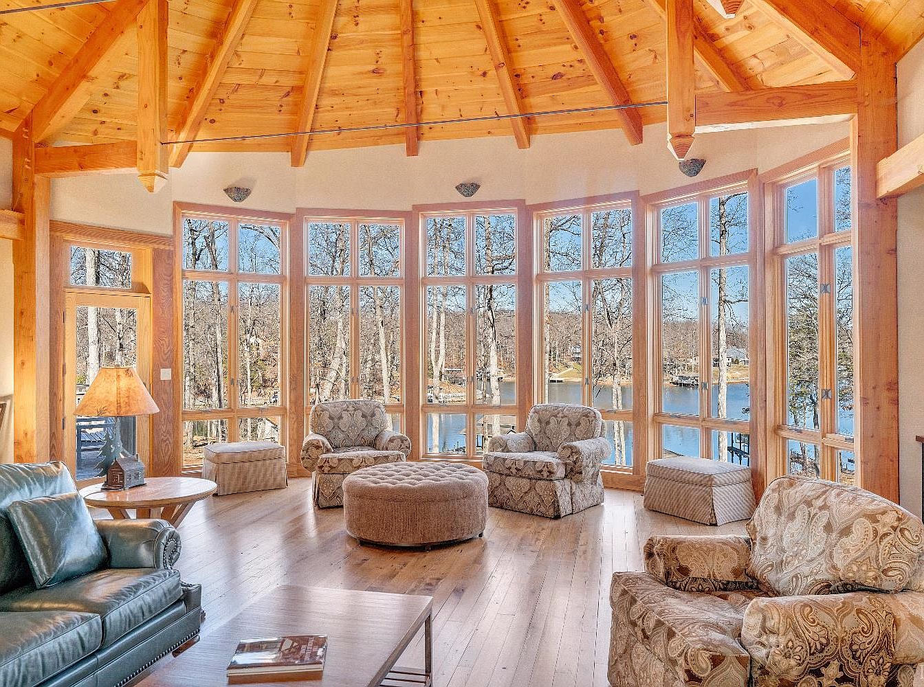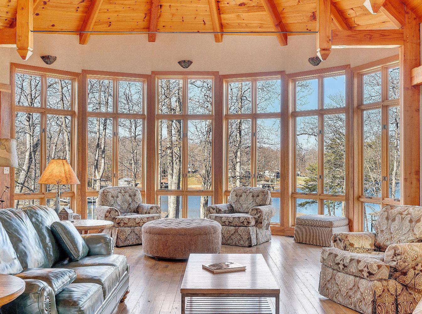 This sunroom features a generous array of large windows that flood the space with natural light, offering scenic views of the surrounding trees and water. The wooden beams of the vaulted ceiling add warmth, complemented by the rich wooden flooring. Comfortable seating includes a dark leather sofa, accentuated by patterned armchairs that introduce a touch of elegance. A round ottoman serves as a cozy centerpiece in front of a light wooden coffee table, which holds a book, inviting relaxation. The overall color palette blends earthy tones with soft textures, creating an inviting atmosphere perfect for tranquility.