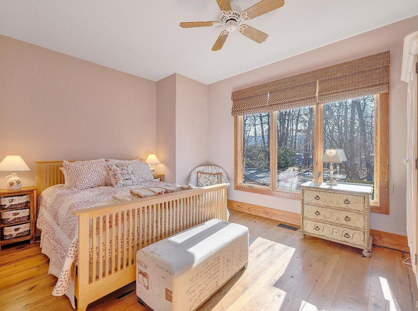 This serene bedroom features a light pink color scheme, enhancing the tranquil atmosphere. A wooden slatted bed frame stands prominently, adorned with floral-patterned bedding and pillows, inviting comfort. On either side, elegant bedside tables with soft lighting create a cozy ambiance. A rustic wooden blanket chest is positioned at the foot of the bed, adding character. Large windows with woven shades frame views of the surrounding nature, allowing natural light to flood in. A delicate lamp sits on a light-colored dresser, complementing the earth-tone decor and enhancing the room’s warm, inviting feel.