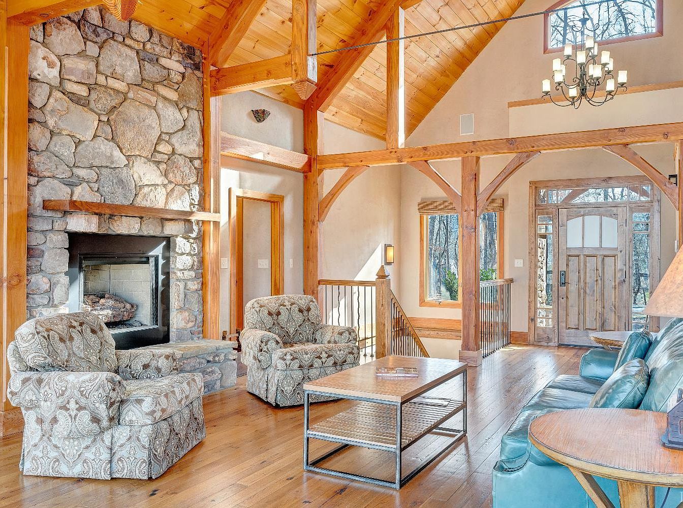 This cozy living room features a striking stone fireplace framed by wooden beams that enhance the rustic charm. The ceiling’s vaulted design showcases exposed wood, creating warmth. Two patterned armchairs and a teal sofa offer inviting seating around a metal-and-wood coffee table. The wooden floor adds a natural touch, harmonizing with earthy tones of the room. Windows allow ample natural light, revealing a wooded view. A stylish chandelier provides overhead illumination, complemented by warm wall sconces. The overall aesthetic combines comfort and elegance, perfect for relaxation and social gatherings in a serene country setting.